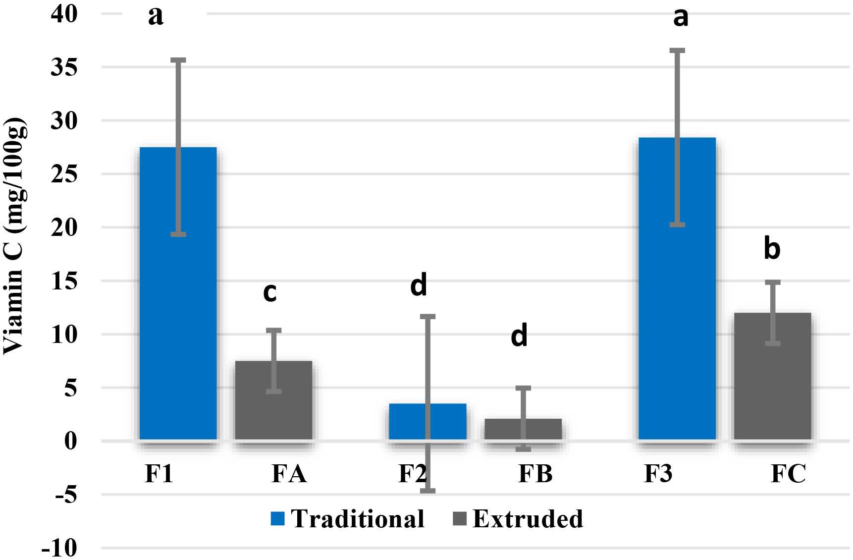 In our study, the effect of extrusion cooking on the vitamin C contents in flours was evaluated (Figure 2). Before extrusion, vitamin C contents of traditional flours were 27.5 ± 1.2, 3.5 ± 0.4 and 28.4 ± 0.1 mg/100 g, respectively for F1, F2 and F3. We found them higher than those obtained by [4] did in blends of millet/Baobab (18 mg/100 g) did, millet/Moringa (1 mg/100 g) and millet/Moringa/Baobab (17 mg/100 g) did. Vitamin C contents were reduced by 73% in FA (7.5 ± 0.5 mg/100 g), by 40% in FB (2.1 ± 0.2 mg/100 g), and by 58% in FC (12 ± 0.8 mg/100 g) after extrusion cooking.