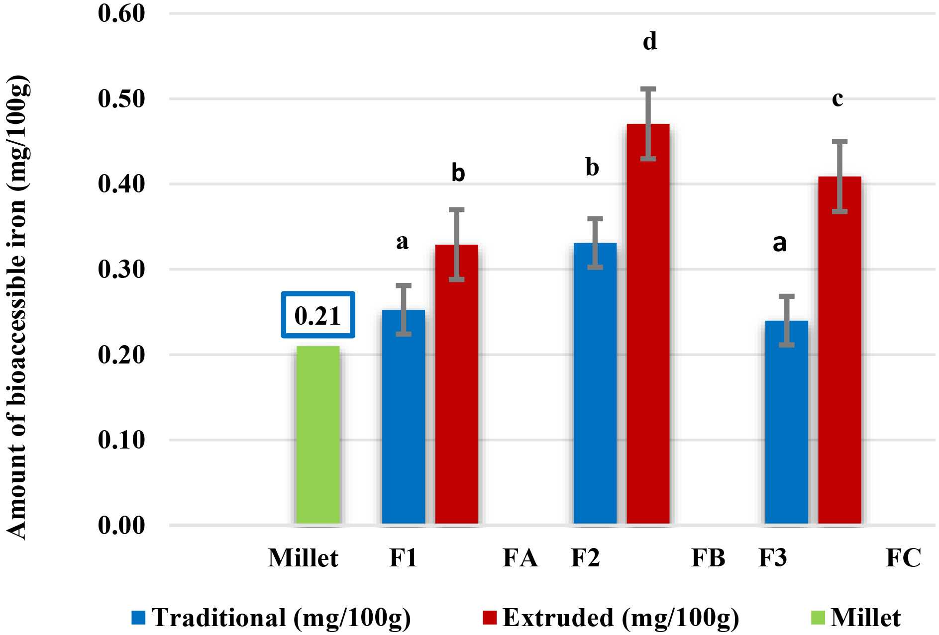 Figure 3. Effect of processing (traditional and cooking-extrusion) on the amount of bioaccessible iron in developed flours. Moringa leaf powder and Baobab fruit pulp was added before cooking extrusion. Each formulation was subjected to two gastric stages, with the intestinal step being each time performed in triplicate and each dialysate is analyzed for its dialyzable minerals (n = 6). Different letters indicate significant differences according to Fischer’s LSD test (p < 0.05). Error bars indicate standard deviation.