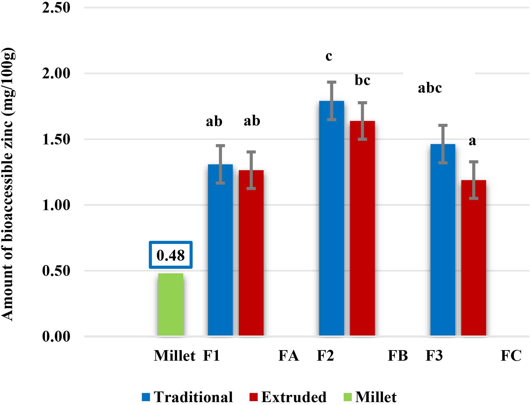 Figure 4. Effect of processing (traditional and cooking-extrusion) on the amount of bioaccessible zinc in developed flours. Moringa leaf powder and Baobab fruit pulp was added before cooking extrusion. Each formulation was subjected to two gastric stages, with the intestinal step being each time performed in triplicate and each dialysate is analyzed for its dialyzable minerals (n = 6). Different letters indicate significant differences according to Fischer’s LSD test (p < 0.05). Error bars indicate standard deviation.