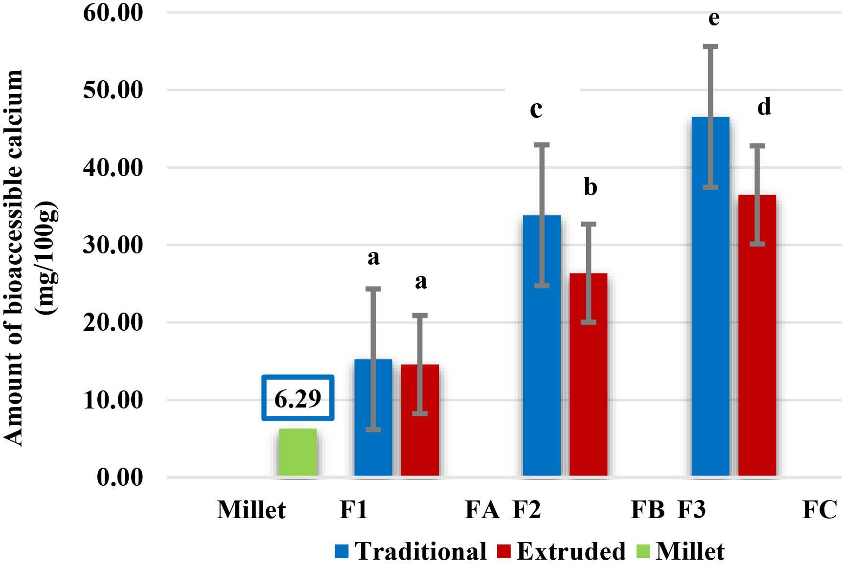 Figure 5. Effect of processing (traditional and cooking-extrusion) on the amount of bioaccessible calcium in developed flours. Moringa leaf powder and Baobab fruit pulp was added before cooking extrusion. Each formulation was subjected to two gastric stages, with the intestinal step being each time performed in triplicate and each dialysate is analyzed for its dialyzable minerals (n = 6). Different letters indicate significant differences according to Fischer’s LSD test (p < 0.05). Error bars indicate standard deviation.