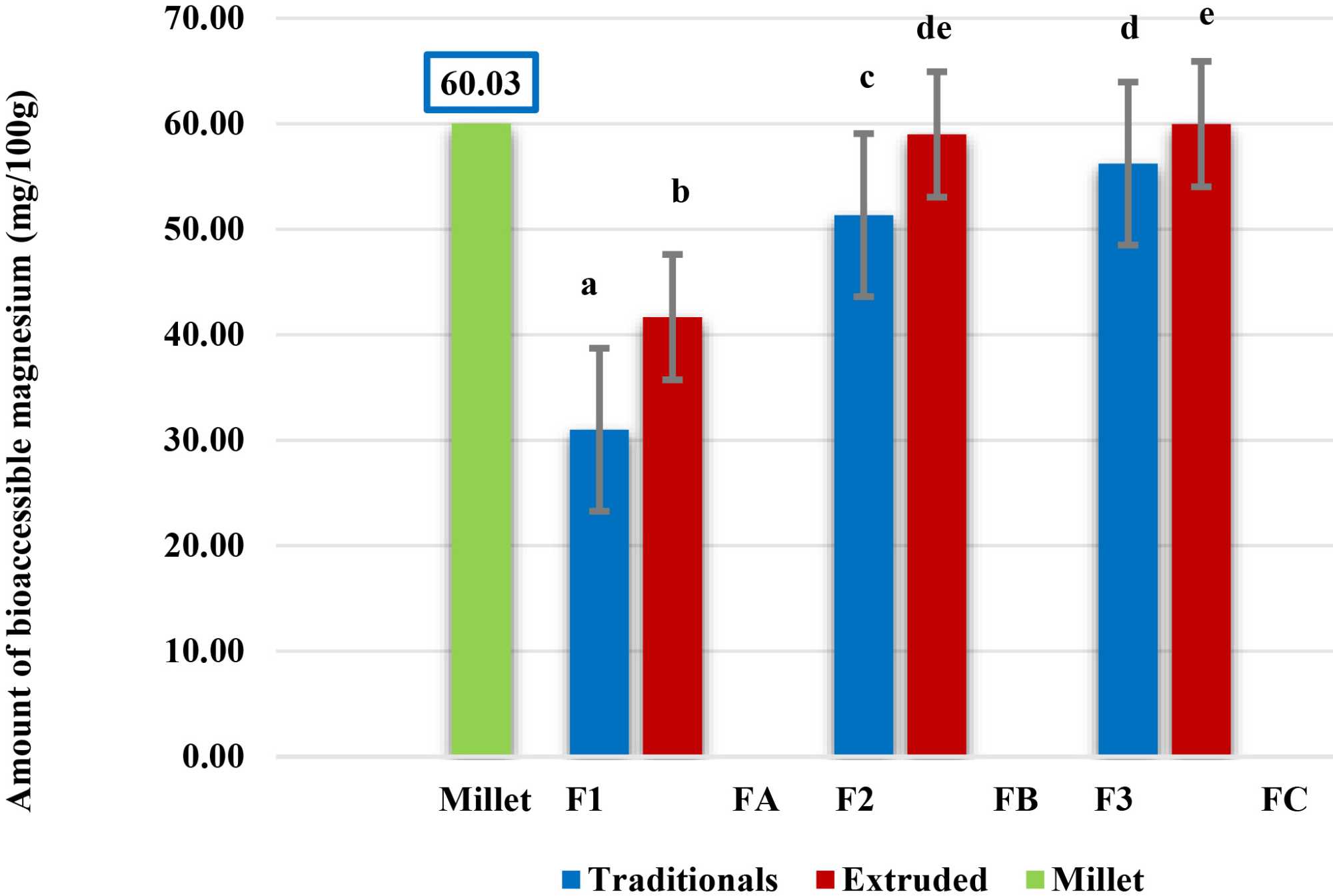 Figure 6. Effect of processing (traditional and cooking-extrusion) on the amount of bioaccessible magnesium in developed flours. Moringa leaf powder and Baobab fruit pulp was added before cooking extrusion. Each formulation was subjected to two gastric stages, with the intestinal step being each time performed in triplicate and each dialysate is analyzed for its dialyzable minerals (n = 6). Different letters indicate significant differences according to Fischer’s LSD test (p < 0.05). Error bars indicate standard deviation.
