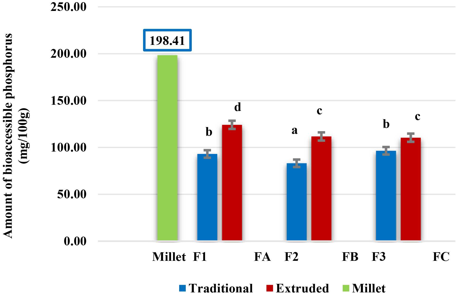 Figure 7. Effect of processing (traditional and cooking-extrusion) on the amount of bioaccessible phosphorus in developed flours. Moringa leaf powder and Baobab fruit pulp was added before cooking extrusion. Each formulation was subjected to two gastric stages, with the intestinal step being each time performed in triplicate and each dialysate is analyzed for its dialyzable minerals (n = 6). Different letters indicate significant differences according to Fischer’s LSD test (p < 0.05). Error bars indicate standard deviation.