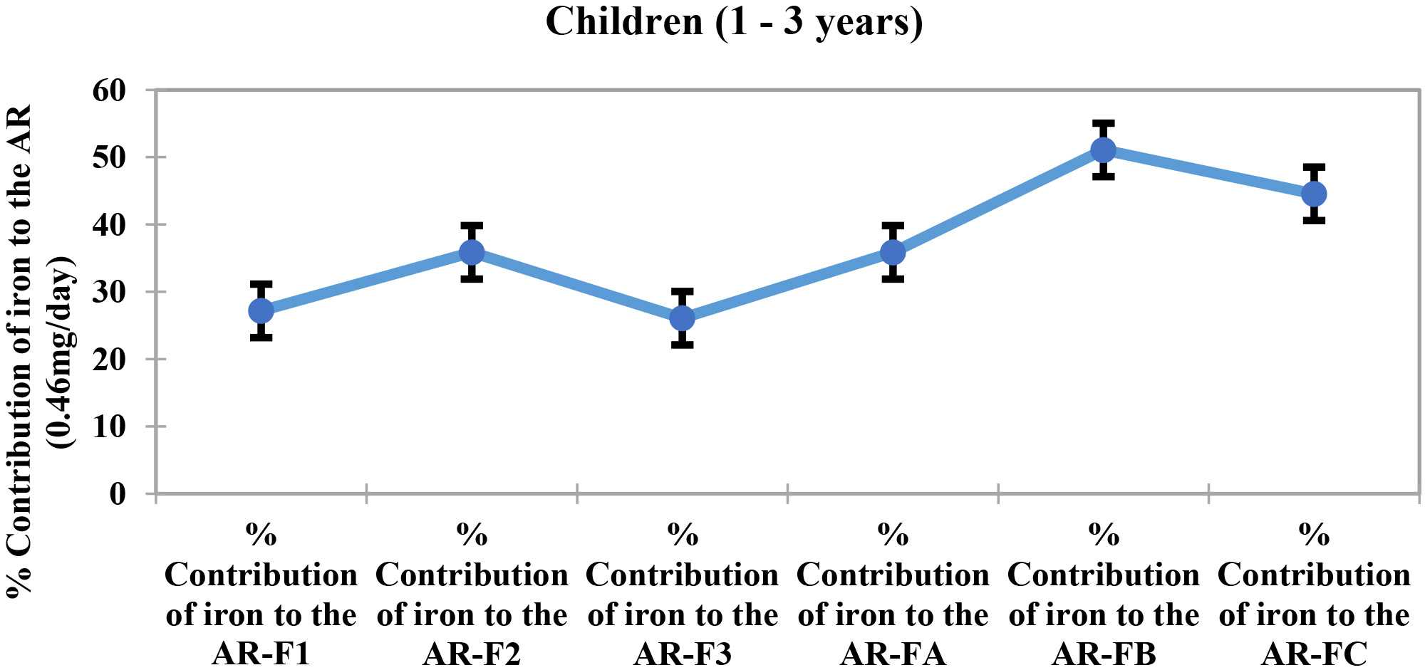 The absolute requirement for bioaccessible iron is the contribution of daily mineral basal losses (via stools, urine, skin and its appendages, milk, menstrual blood and semen) and iron quantities necessary for growth [28]. The percentage contributions of 50 and 75 g of the developed flours to the AR in iron bioaccessible were calculated according to [15]. Extruded flour FB (millet/Moringa powder) gives the highest percentage of bioaccessible iron contribution for children aged 1 to 3 years and for lactating women to the ARs. This indicates that the iron status of children aged 1 to 3 years and lactating women consuming such extruded food-to-food fortified flour could potentially increase the percentage contribution of iron to ARs, with a daily consumption [6] [15].