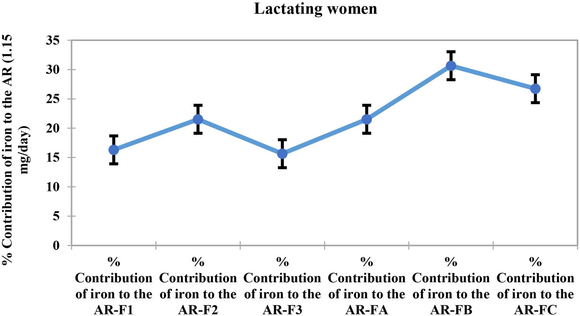 Figure 9. Percentages contribution of bioaccessible iron content in developed flours to the absolute iron needs for lactating women. According to the absolute requirement for lactating women consuming a plant-based diet with the lowest level of iron bioavailability (5%). Error bars indicate standard deviation.