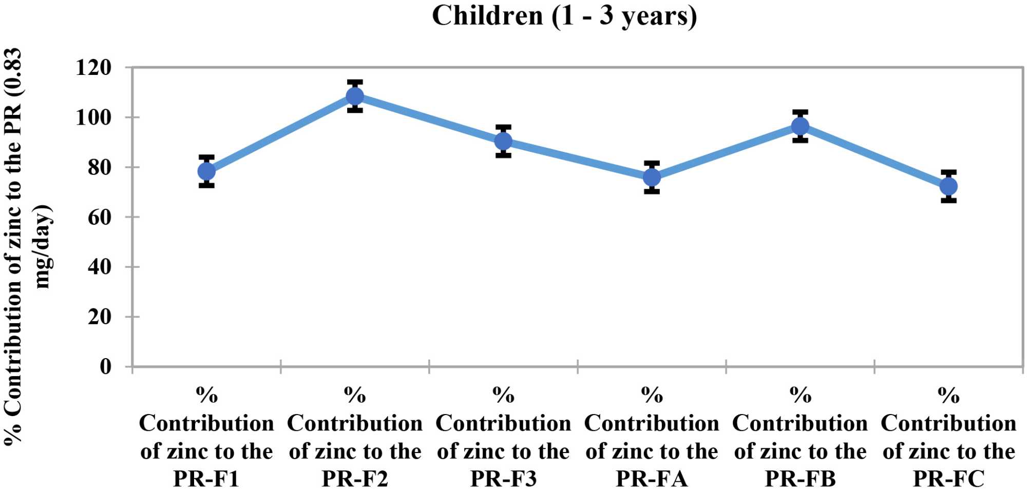Figure 10. Percentages contribution of bioaccessible zinc content in developed flours to the physiologic requirements needs for children aged 1 - 3 years. According to the physiologic requirement for children consuming a plant-based diet with the lowest level of zinc bioavailability (15%). Error bars indicate standard deviation.