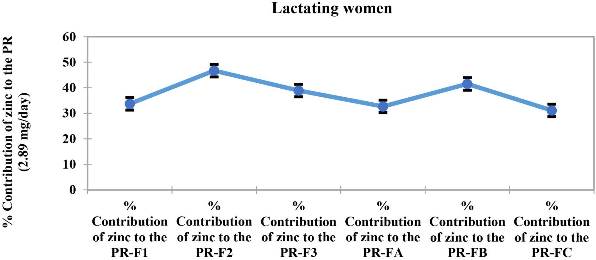 Figure 11. Percentages contribution of bioaccessible zinc content in developed flours to the physiologic requirements needs for lactating women. According to the physiologic requirement for lactating women consuming a plant-based diet with the lowest level of zinc bioavailability (15%). Error bars indicate standard deviation.