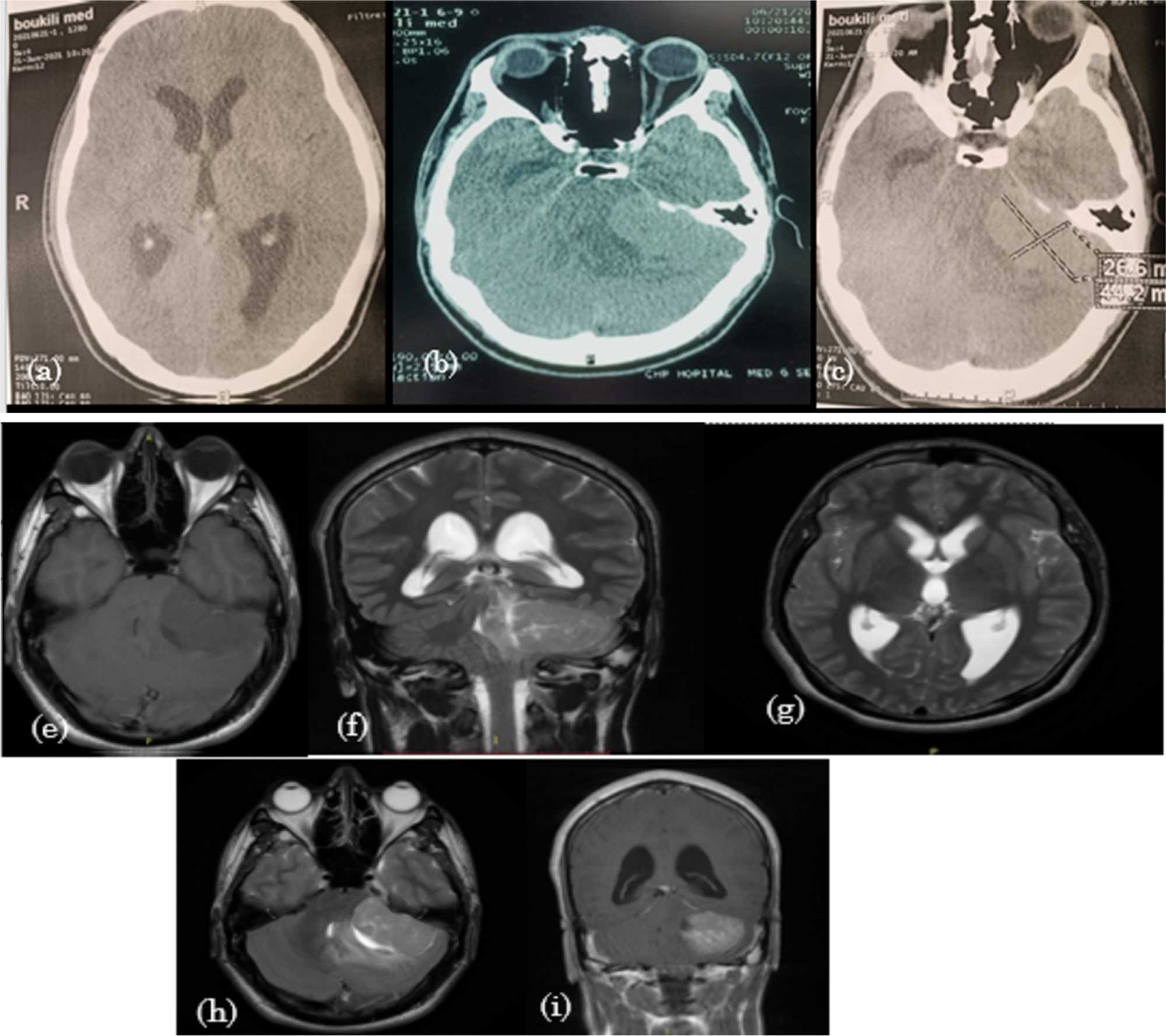 Figure 1. Pre-operative brain CT scan (a)-(c) showing an extra-axial mass at the left ponto-cerebellar angle compressing the fourth ventricle and causing tri-ventricular hydrocephalus. Pre-operative brain MRI: (e) Axial T1 showing a hypointense mass and (f) Coronal T2 showing a heterogeneous mass in the left cerebellopontine angle. (g) Axial T2 showing tri-ventricular hydrocephalus. (h) Axial T2 FLAIR showing adjacent cerebellar edema. (i) Coronal T1 after contrast injection showing moderate heterogeneous enhancement and a large tentorial attachment.