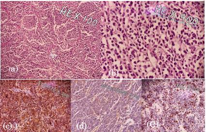 Figure 2. ((a), (b)) Histopathology revealed a highly cellular tumor composed of rosettes of small round cells, with a high nucleus-to-cytoplasm ratio and increased mitotic figures (c)-(e): The immunohistochemical analysis shows diffuse synaptophysin positivity in tumor cells, confirming the neuroectodermal nature. Expression of Ki67 in 50% of cells, with no nuclear expression of beta-catenin, suggesting a classic non-Wnt type medulloblastoma.