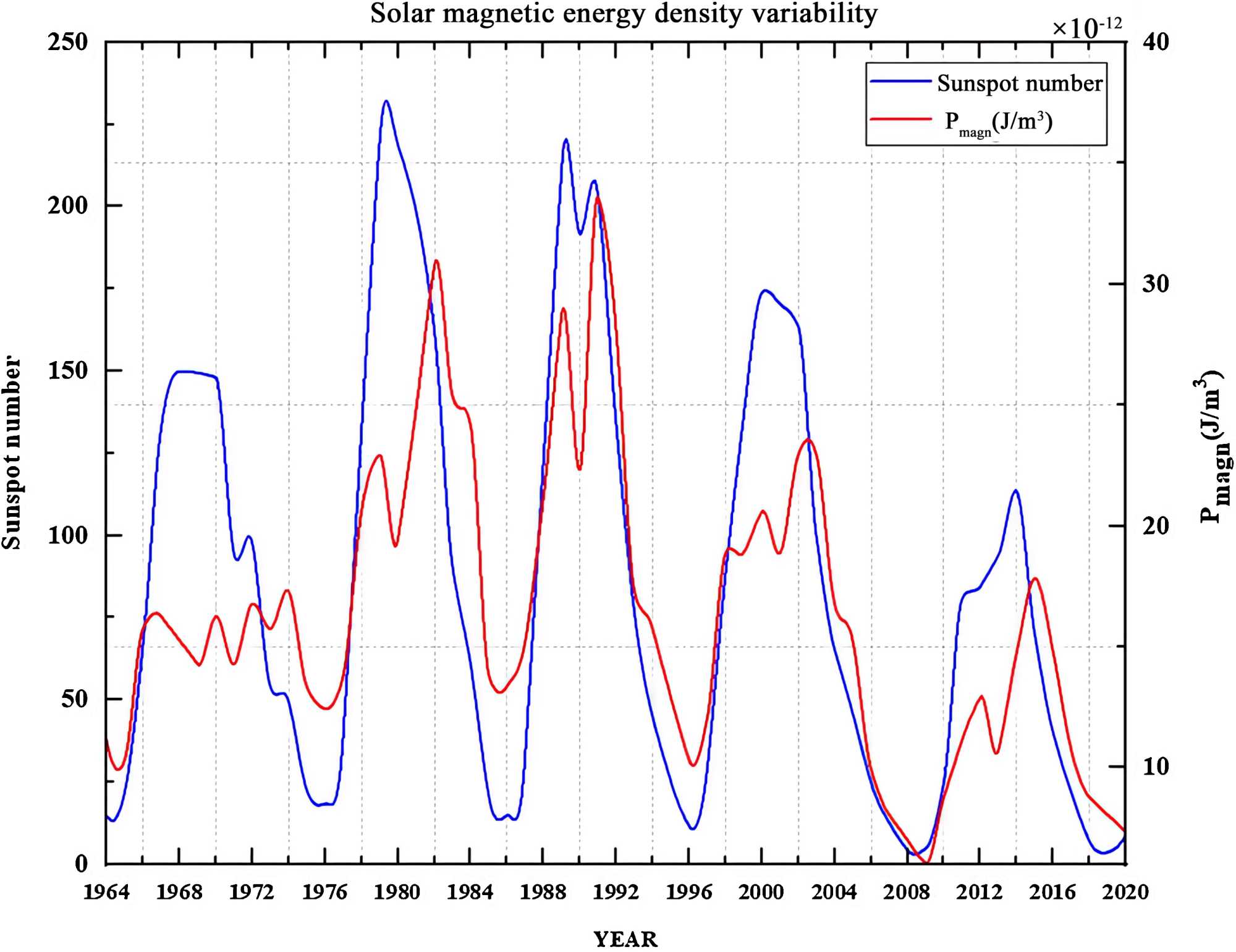 Figure 1 shows the profiles of annual mean values of solar magnetic energy density and sunspots number for five recent solar cycles (1964 to 2019). These two profiles evolve in an almost similar way. Maximum and minimum values of magnetic energy density are observed during the descending and the minimum phase of each solar cycle. These observations suggest that strong disturbances associated with fast solar wind flows impact solar magnetic energy density, leading to an increase in Sun’s magnetic pressure. The increase in Sun’s magnetic pressure could be associated with solar flares. Solar flares can emit solar energetic particles that can affect Earth’s space weather. We observe a lag between solar magnetic energy density peaks and sunspot number. In addition, there is a double peak constitute of a small peak followed by a larger one in solar magnetic energy density profile during each solar cycle. These two peaks are observed around maximum phase of each solar cycle. The appearance of these double peaks would be attributed to expression of two components of solar magnetic field (toroidal magnetic component and poloidal magnetic component). The toroidal solar magnetic field is generated by Sun differential rotational motion. The lines of the Sun’s toroidal magnetic field can often open and extend into interplanetary space, resulting in magnetic surges as they interact with solar wind [13].