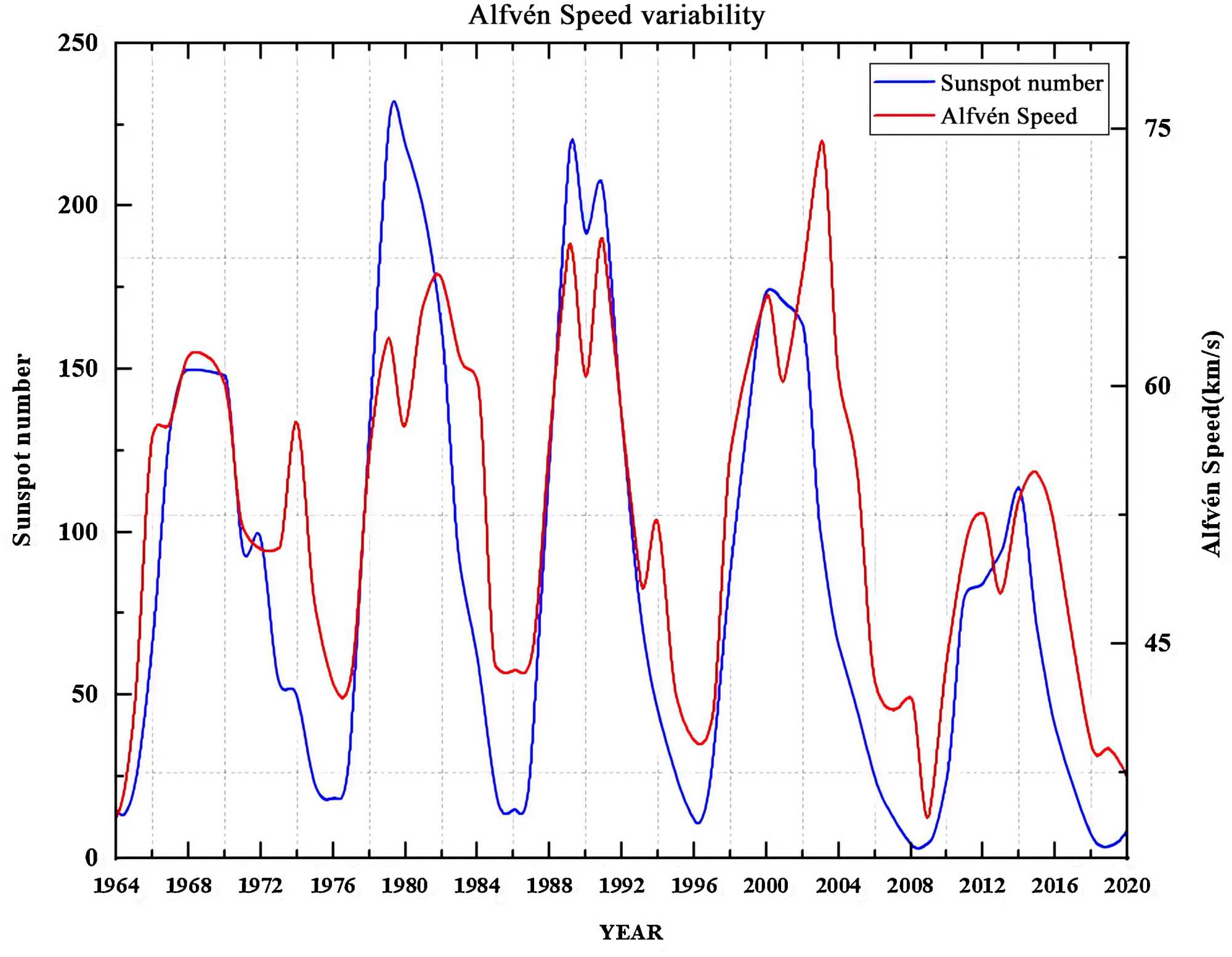 Figure 2. Variations of annual means Alfvén velocities and sunspot numbers of 5 solar cycles (1964 to 2019).