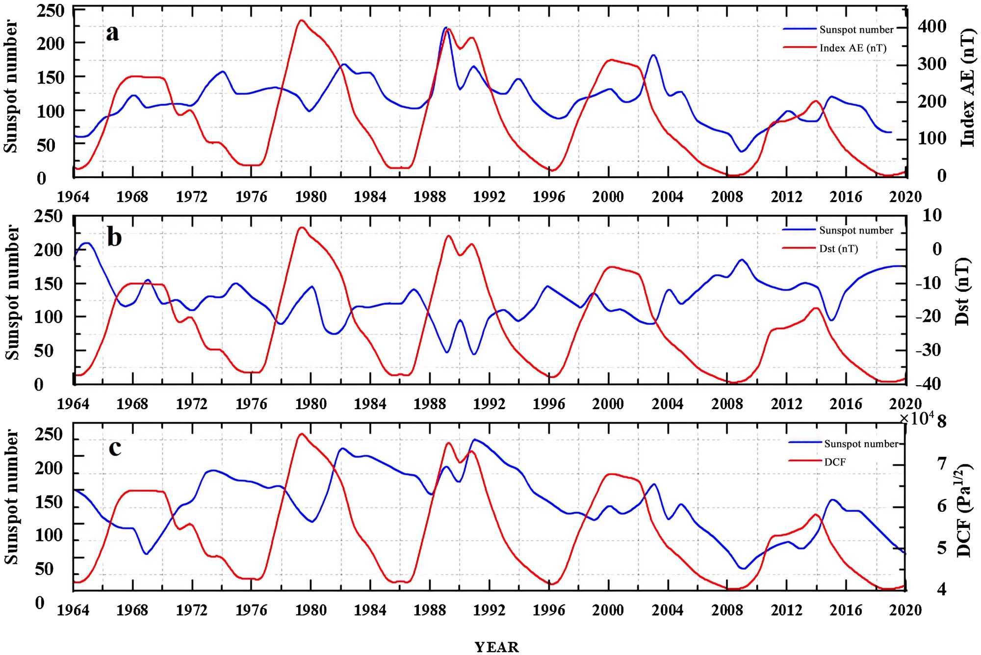 Figures 3(a)-(c) show the profiles of annual values of AE, Dst and DCF during the last five solar cycles (196-2020). The largest values of AE index are observed at the descending phase of each solar cycle (283 nT at 1974, 299 nT at 1982, 228 nT at 2003 and 216 nT at 2015) except in solar cycle 21 where we record large value at maximum phase of solar cycle (401 nT at 1989) due to a solar storm four times larger than normal observed at this time by Carrington from Earth [15]. Weak values are observed at minimum phase of each solar cycle (113 nT at 1965, 192 nT at 1986, 167 nT at 1996 and 70 nT at 2009). These observations would be attributed to Alfvén waves present in solar wind which play an important role in auroral currents generation [16] [17]. During the descending phase of solar