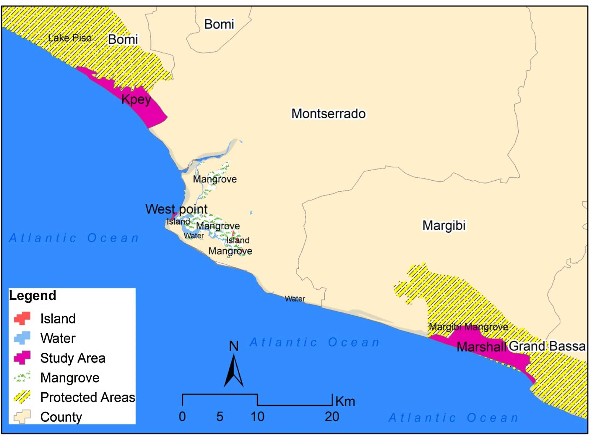 The research was conducted in West Point, a highly populated slum in Monrovia, the capital of Liberia. West Point is situated on a slender peninsula between the Atlantic Ocean and the Mesurado River, at coordinates 6.3234˚ N, 10.8007˚ W (Figure 2). The St. Paul Bridge fishing hamlet, located on the periphery of Monrovia adjacent to the St. Paul River, which empties into the Atlantic, is a prominent fishing area at the bridge across the river, with coordinates 6.3806˚N, 10.7778˚W. Marshall, a coastal municipality in Margibi County southeast of Monrovia, is situated between the Junk and Farmington Rivers, providing access to the Atlantic Ocean at coordinates 6.1367˚N, 10.3483˚W. Liberia, situated in West Africa on the North Atlantic coast, is bordered by Sierra Leone to the northwest, Guinea to the north, and Côte d’Ivoire to the east. The coastline stretches 560 kilometers (350 miles) along the Atlantic to the south and southwest. Monrovia, the capital, is located on the coast in the central-western part of the country. Liberia is situated geographically between latitudes 4˚21'N and 8˚33'N, and longitudes 7˚22'W and 11˚30'W. The landscape mostly comprises coastal plains, ascending to rolling hills and a hilly plateau in the northern region, which houses Mount Wuteve, the highest elevation at 1440 meters (4724 feet), located (World Atlas, 2021).