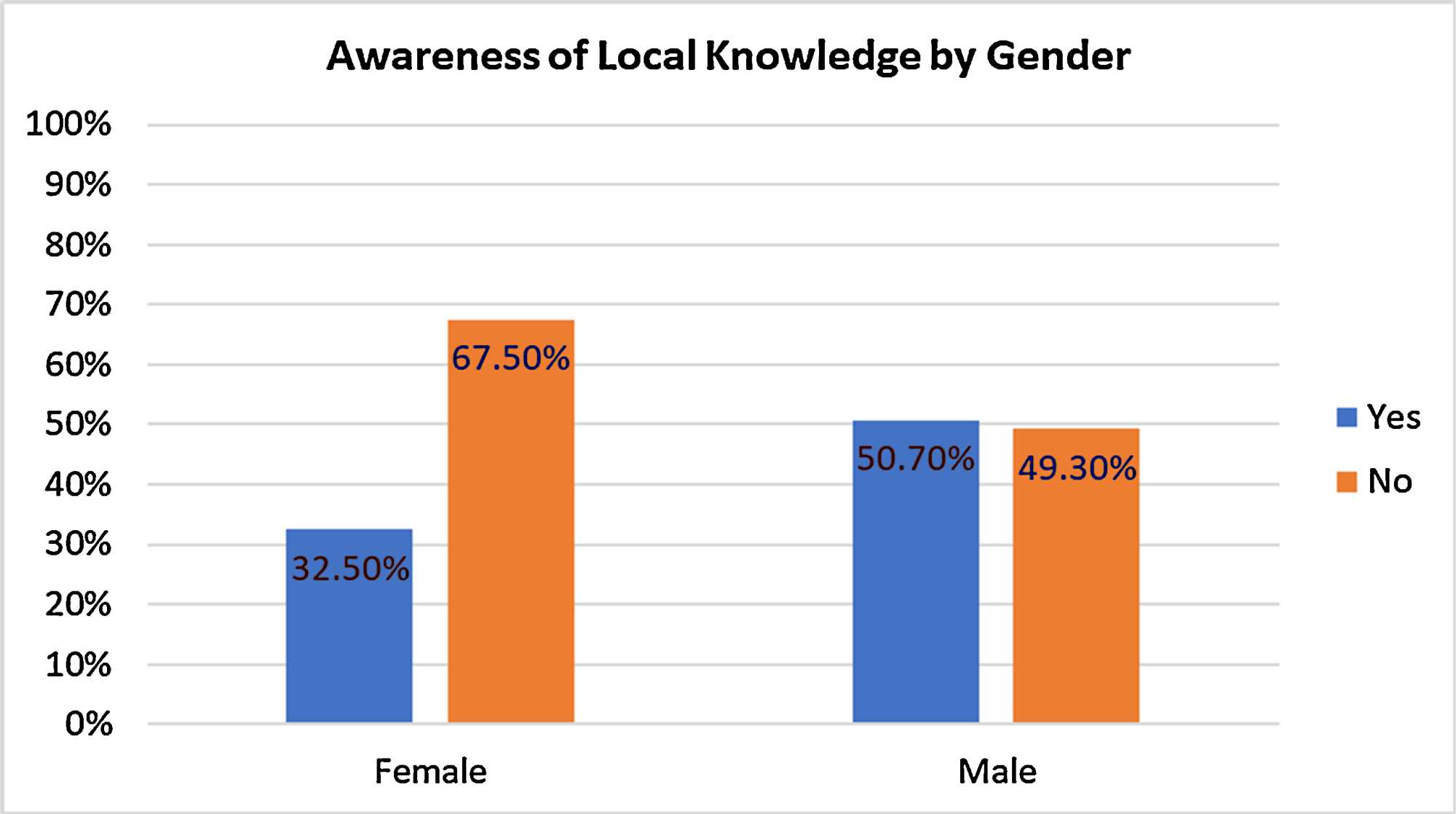 Figure 6 shows that 51% of male respondents are aware of local knowledge, compared to only 32% of female respondents, with 68% of women reporting no awareness. A chi-square test revealed a statistically significant association between gender and local knowledge awareness (X2 = 11.899, df = 1, p = 0.0005617), indicating that gender plays a crucial role in shaping local knowledge awareness. This disparity impacts climate adaptation strategies in small-scale fisheries. Men, who are primarily involved in fishing, depend on community norms and local knowledge to adapt to climate change. However, the exclusion of women, who play vital roles in post-harvest activities, undermines the inclusivity and effectiveness of these strategies.