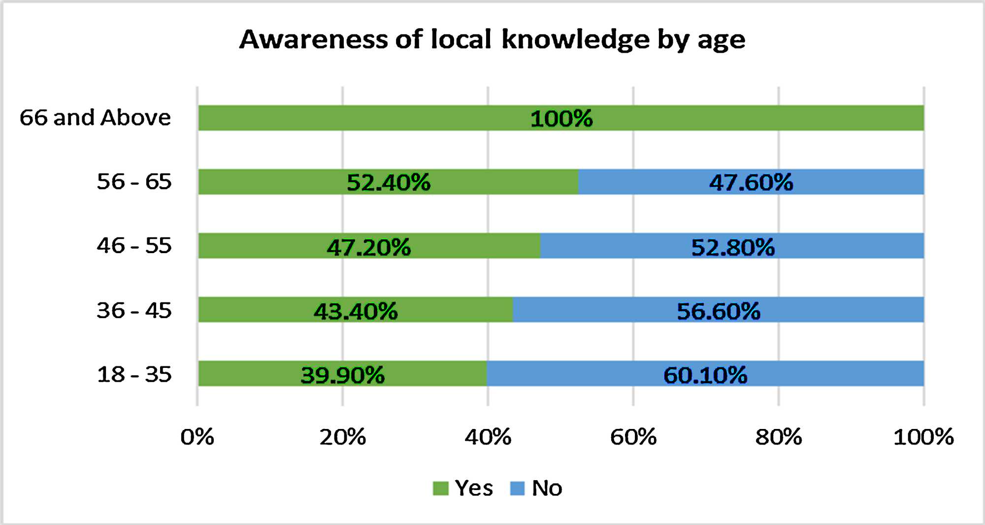 The analysis shows no statistically significant association between local knowledge and age (X2 = 4.6433, df = 4, p = 0.3259), indicating that awareness of local knowledge does not vary significantly across age groups. However, Figure 7 highlights that age does influence the distribution of local knowledge awareness. Among respondents aged 18 - 35 years, 60% are unaware of local knowledge, compared to 57% in the 36 - 45 age group. Awareness increases with age, with 53% of respondents aged 46 - 55 years and 100% of those aged 66 and above reporting full awareness.