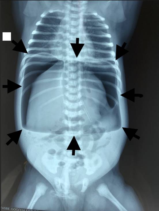 A 3-day-old female neonate (38 weeks of gestation) products of vaginal delivery term, with a birth weight of 3200 g, and an APGAR score of 8 and 9 at 1 and 5 min, respectively. She was referred for abdominal distention. On day 2 of life, the patient presented with an unquantified fever and episodes of food vomiting. On Day 3, abdominal distention with dyspnea prompted a consultation in the department.