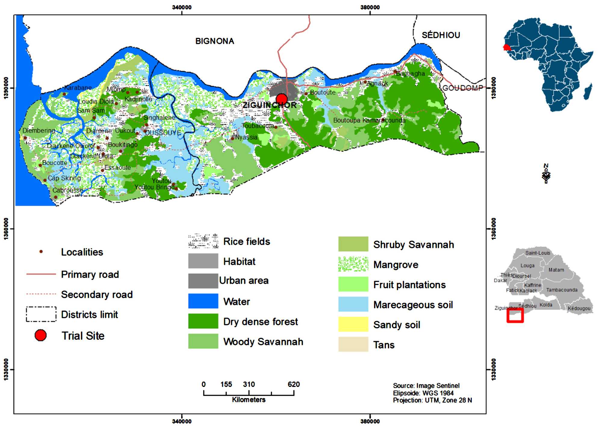 The study was conducted in the experimental farm of the Agroforestry Department of Assane SECK University in Ziguinchor region. The experimental farm of Agroforestry Department is located at 12˚32'54.88'' North latitude and 16˚16'40.89'' West longitude (Figure 1). Ziguinchor region is characterized by an average annual rainfall of 1322.66 mm between 1984 and 2015 with a rainy season that extends from June to October and a Sudano-Guinean type of climate [17] and an average temperature of 27.10˚C.