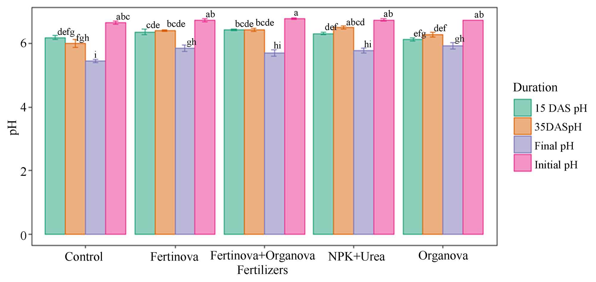 Soil samples were taken at a depth of 10 cm depending on the fertilizers according to the duration for the initial, 15 and 35 days after sowing (DAS) and final phase of the rice cultivation. The soil samples were analyzed for soil pH using a pH meter.