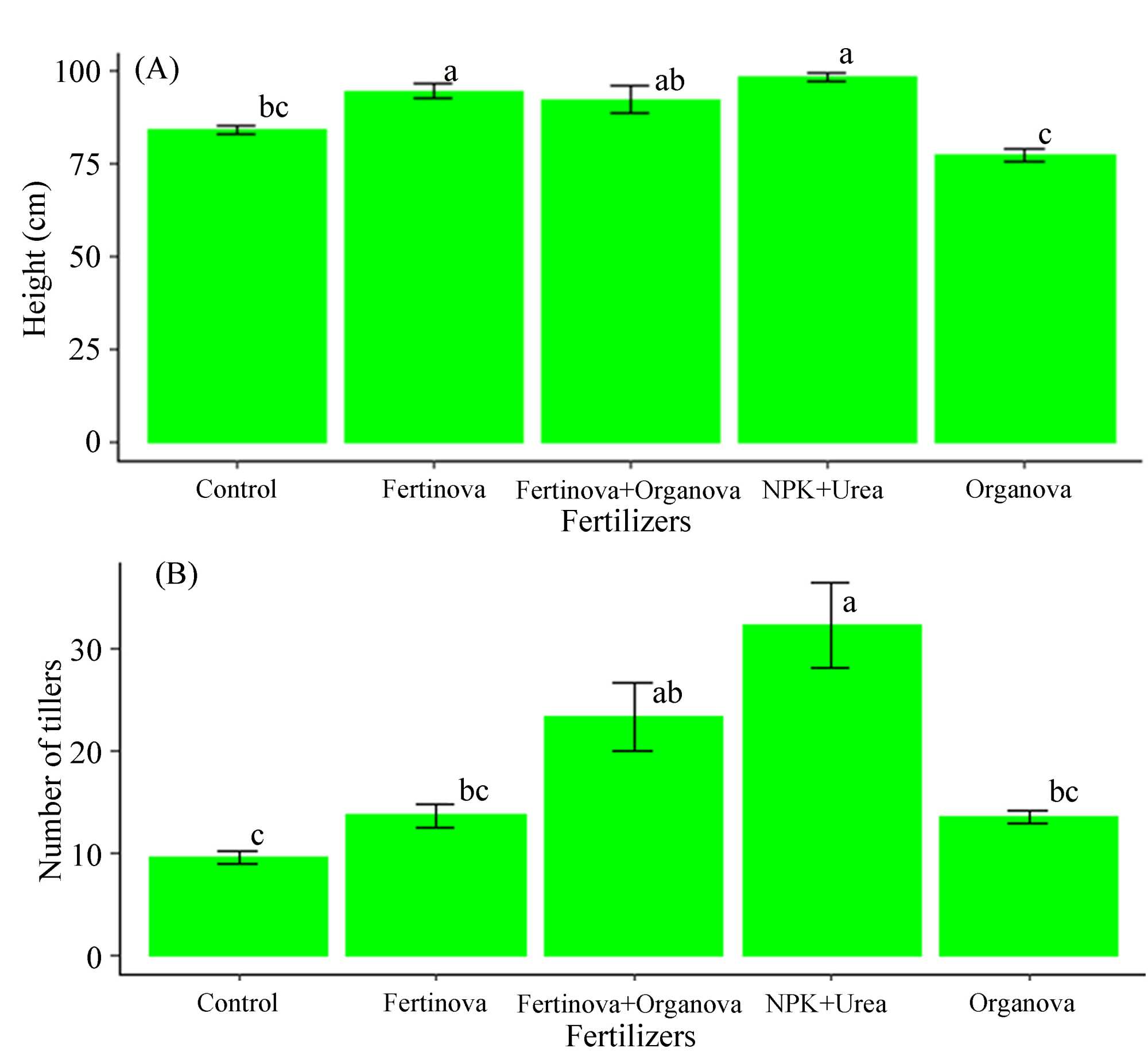 The growth parameters (height, number of tillers and spikelets and length of panicles) varied significantly (p < 0.05) between fertilizers (Figure 3). NPK + Urea (98.6 ± 1.33 cm), Fertinova (94.73 ± 1.97 cm) and Fertinova + Organova (92.4 ± 3.78 cm) recorded significantly the highest plant height than Control (84.33 ± 1.39 cm) and Organova (77.53 ± 1.65 cm).