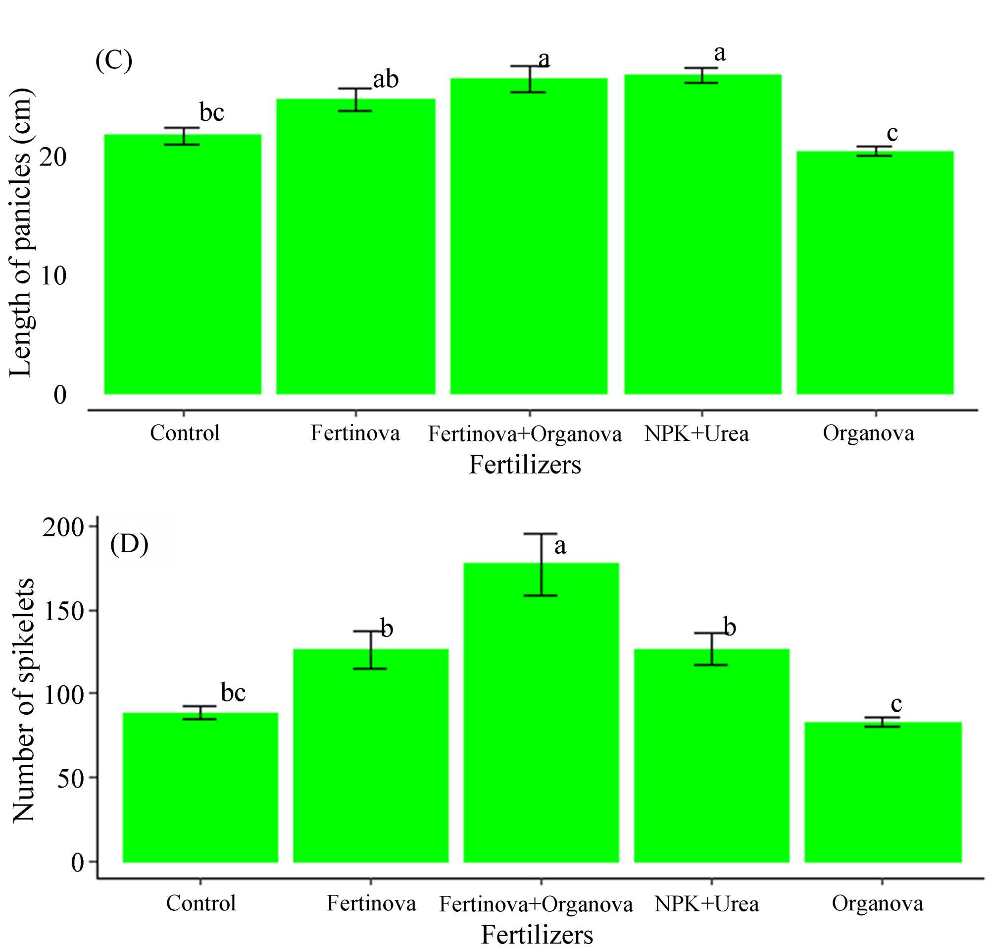 Figure 3. Variation of plant height (A), number of tillers (B), length of panicles (C) and number of spikelets (D) according to fertilizers.