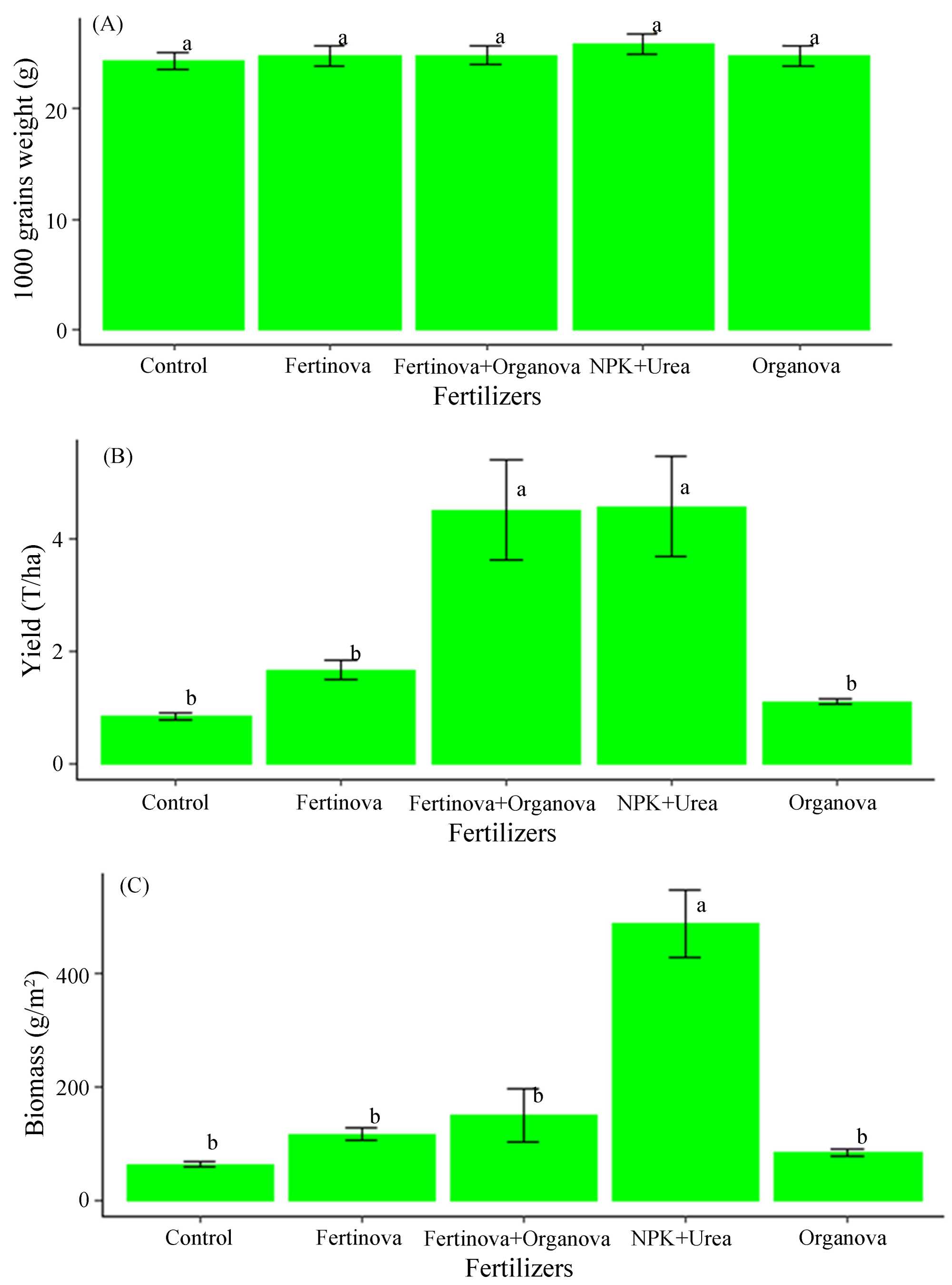 Figure 4. Variation of 1000 grains weight (A), yield (B) and biomass (C) according to fertilizers.