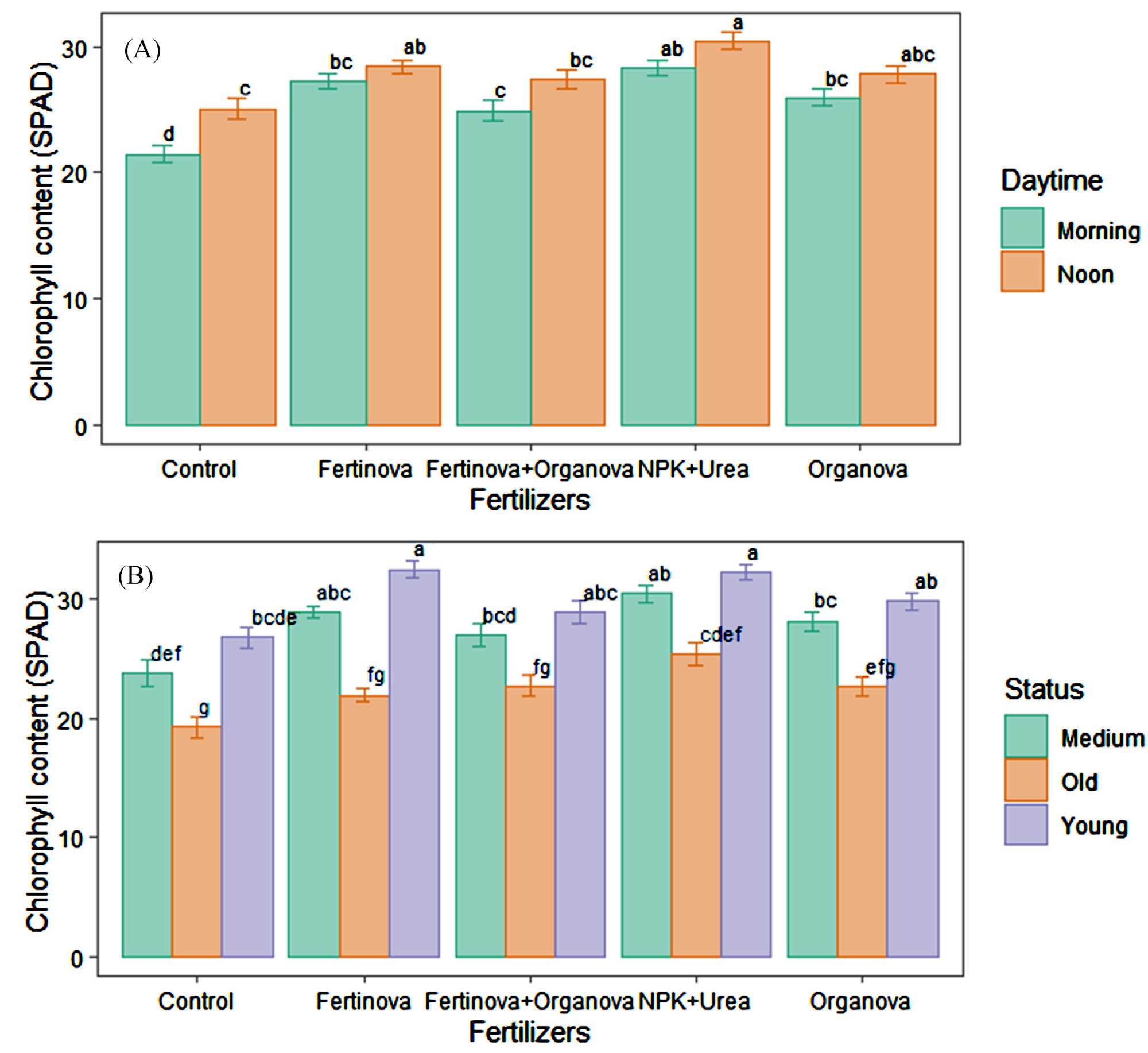 Figure 5. Change in Chlorophyll content of rice leaves in responses to daytime (A), status of leaves development and fertilizers (B).
