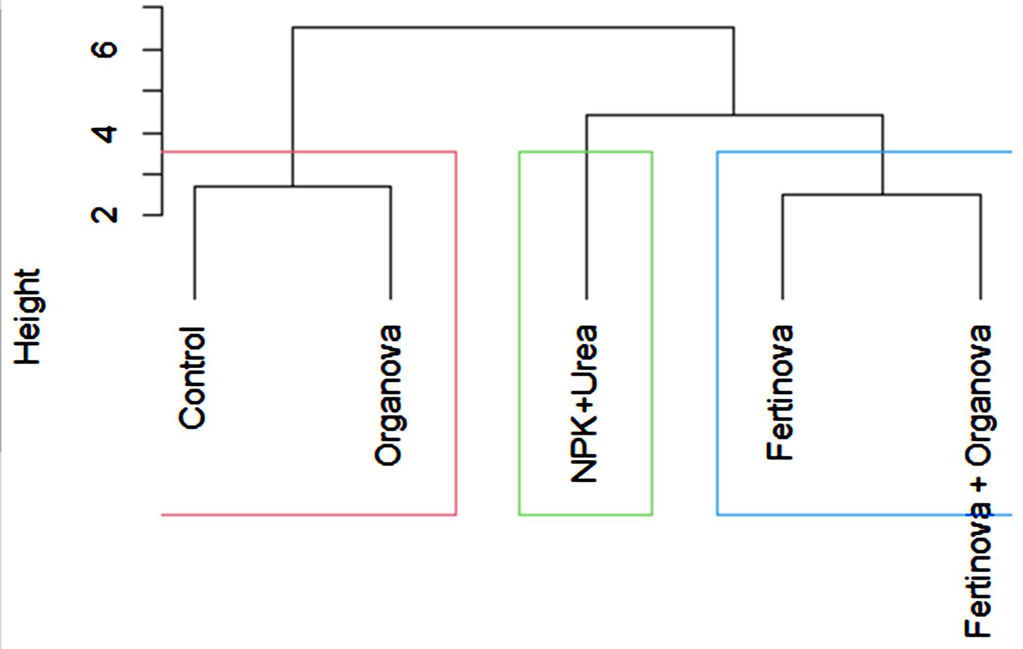 Figure 6. Cluster dendrogram of agrophysiological parameters between fertilizers of 1000 grains weight (A), yield (B) and biomass (C) according to fertilizers.