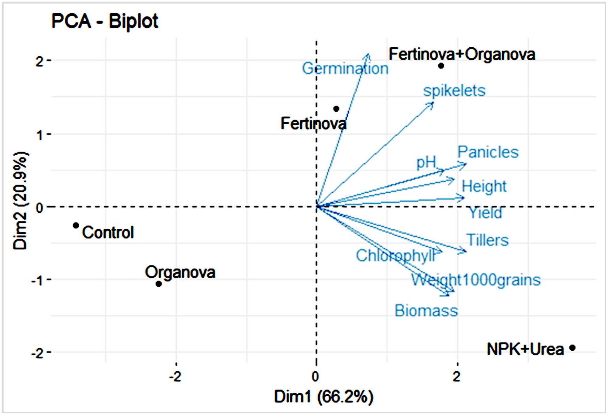 Clustering analysis revealed three groups according to the fertilizers. The first group was composed of Control and Organova, and characterized by very low chlorophyll content, growth and yield parameters and yield. The second group is constituted of NPK + Urea and favored high chlorophyll content, height, biomass and number of tillers. However, the last group composed of Fertinova and Fertinova + Organova and was characterized by higher yield, panicle length, number of spikelets and soil pH (Figure 6 and Figure 7). Principal component analysis (PCA) showed an overall positive correlation between agrophysiological parameters and yield. Yield was positively correlated with plant height, number of tillers, number and length of panicles, number of spikelets and 1000-grain weight, biomass and chlorophyll content. The number of tillers was also correlated with all