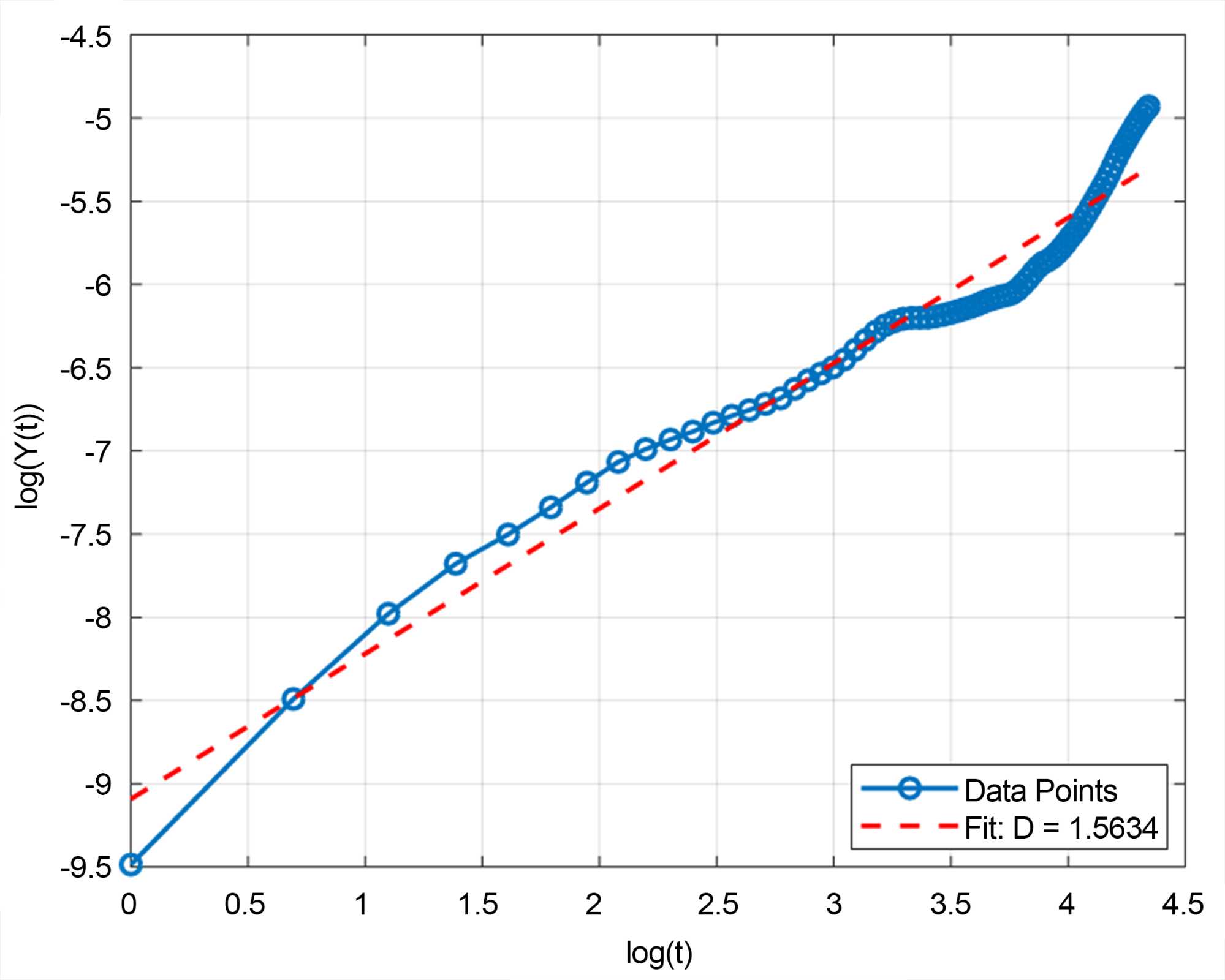 The slope of this linear fit was used to calculate the Hurst exponent (