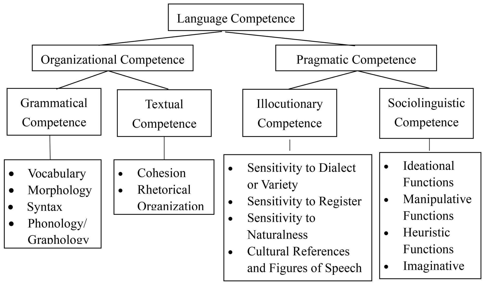 Bachman and Palmer’s (2010) language competence model analyse this construct under two general components: pragmatic competence and organizational competence. Within the organizational competence, there is another dichotomy between textual competence and grammatical competence. Grammatical competence is understood as the fundamental components of language structure, such as vocabulary, morphology, syntax, and phonology/graphology that are essential to the correct and coherent production of language. Textual competence emphasizes the importance of cohesion and rhetorical organization of language, both of which are essential to the construction of coherent and systematically organized texts. The aforementioned qualities all build a base that enables the comprehension of and the creation of grammatically correct and context-sensitive language.