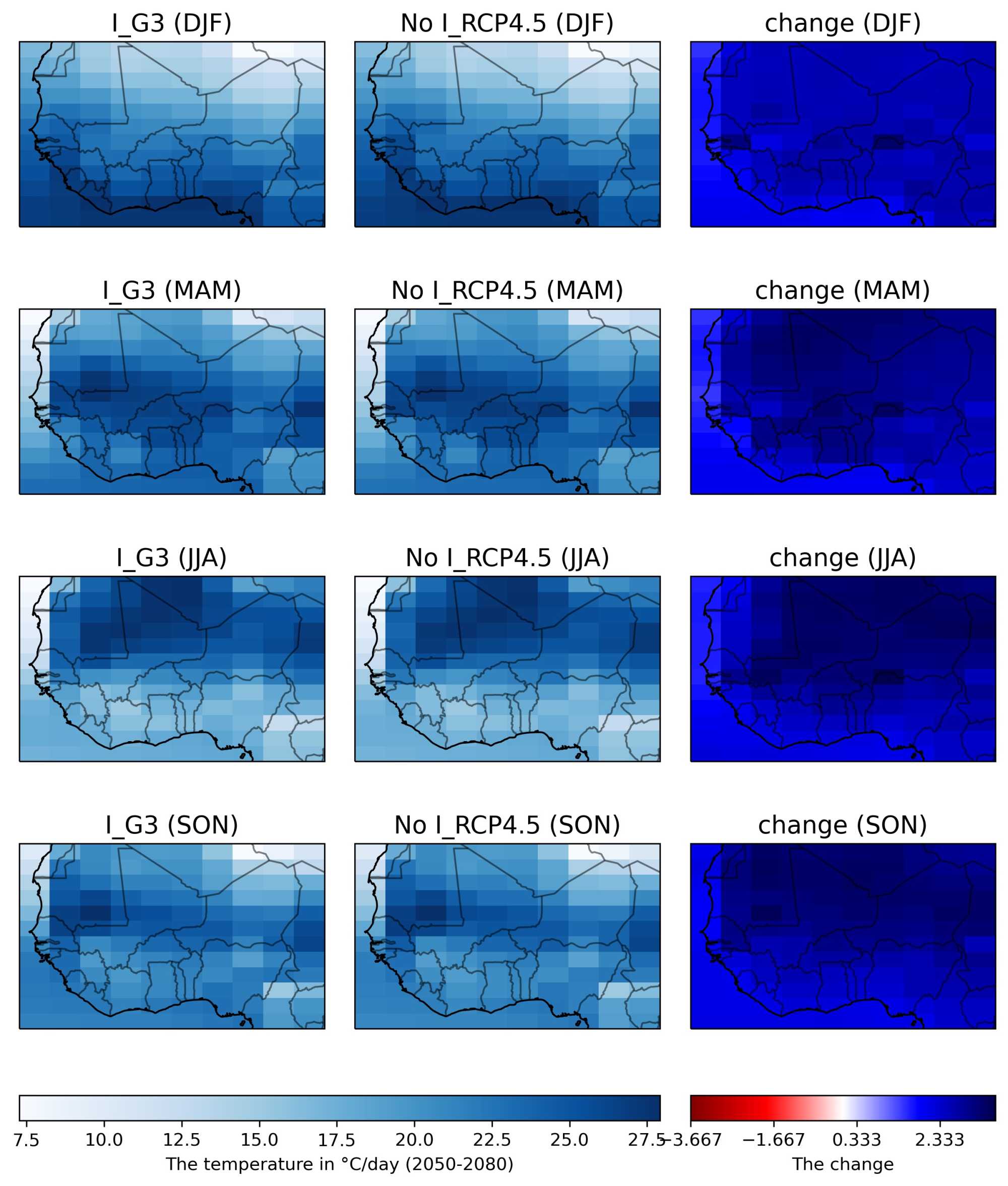 In this part, the impacts of anthropogenic forcing at mean level SI_RCP4.5 on temperature and precipitation regimes and the extent to which temperature and precipitation regimes have been affected relative to historical time are presented. The projected changes in temperature over the different seasons namely the cold dry season (DJF), the hot dry season (MAM), the rainy season (JJA) and the transitional season between the cold season and the rainy season (SON) and temperature variations are shown in figures