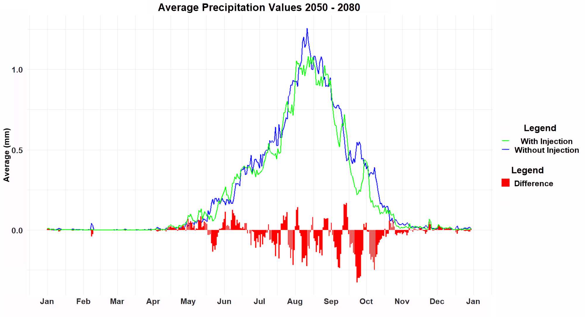 Figure 12. Comparison of daily precipitation with and without SO2 injection (2020-2050).