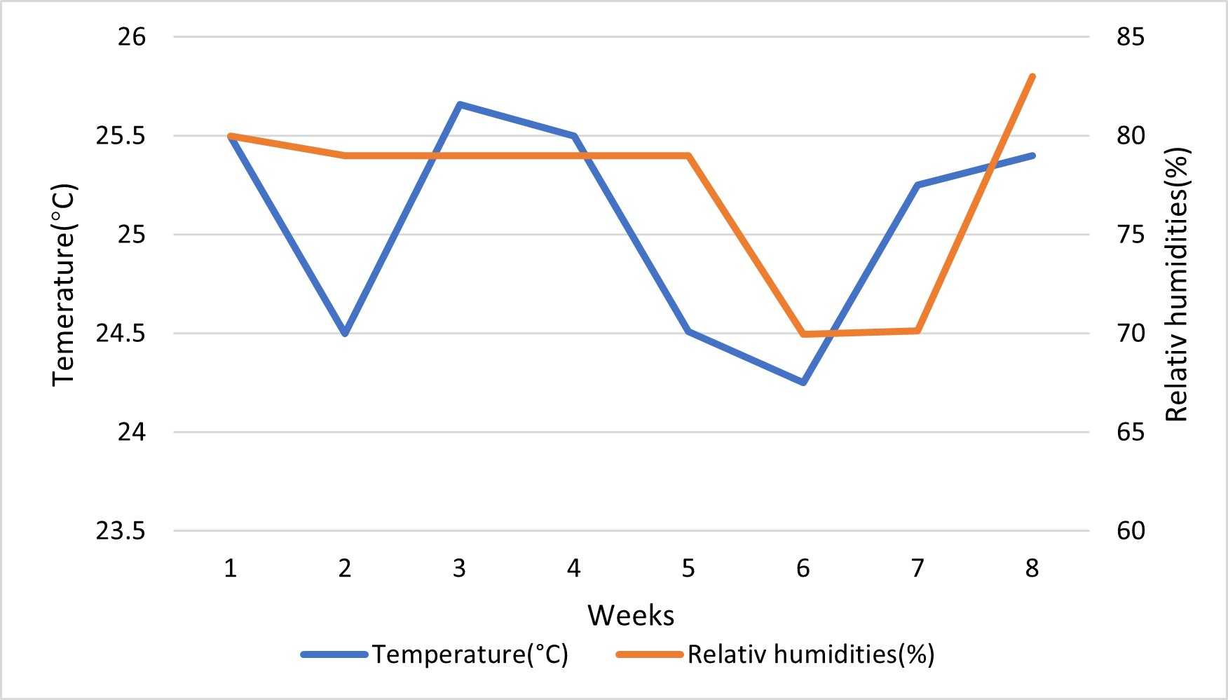 Figure 1. Temperatures and relative humidities recorded in the experimental room during the experiment.