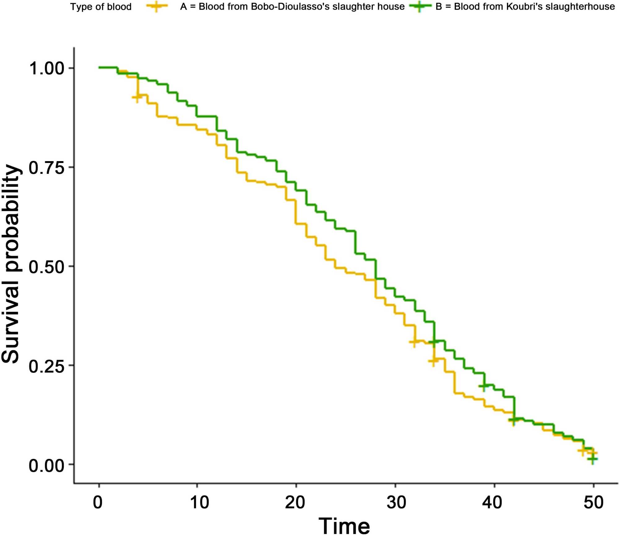 Analysis using the Cox model showed that the survival rate was not significantly influenced by the origin of the blood used (X2 = 1.14, p = 0.18) (Figure 2) and sex (X2 = 1.53, p = 0.21).