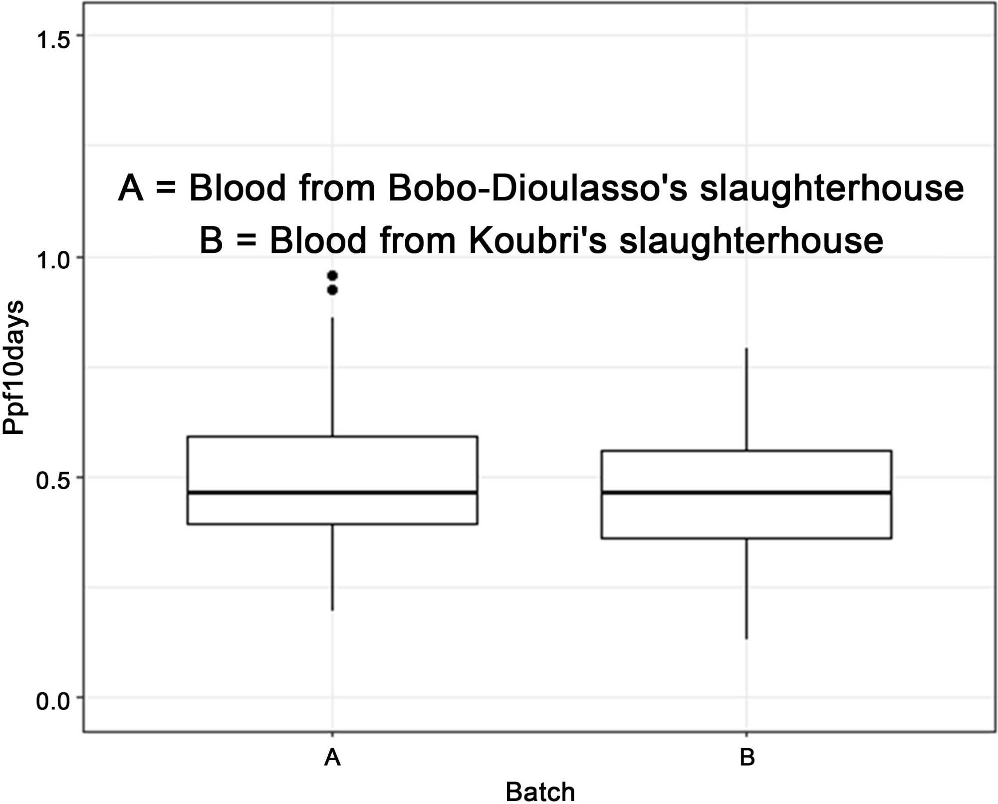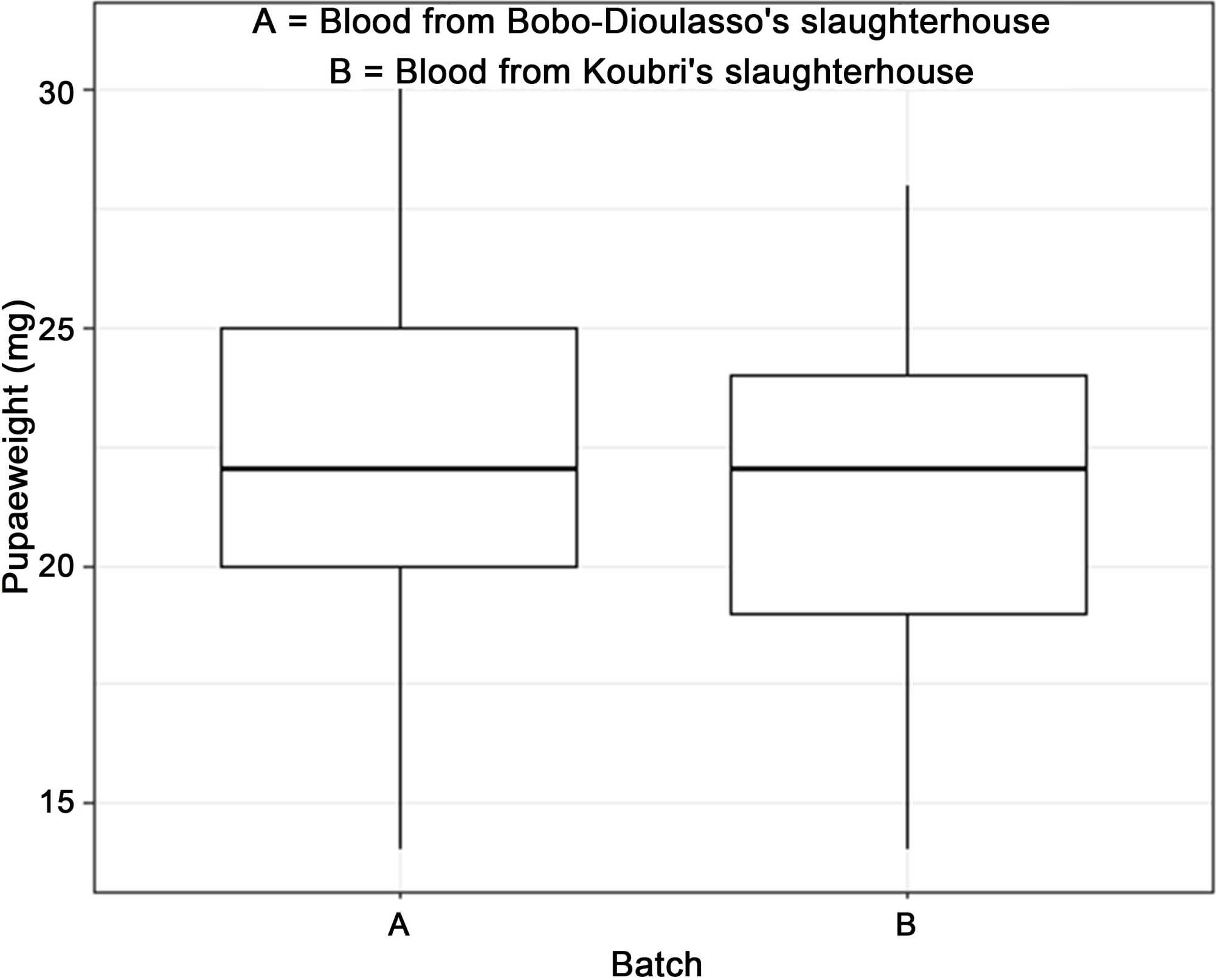 There was a highly significant difference (p = 4.18e−05) (Figure 3) between the weight of pupae from female tsetse fly fed with blood from the Bobo-Dioulasso slaughterhouse compared with blood from Koubri in the different batches.