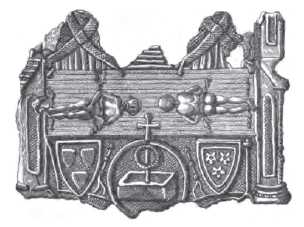 Figure 2. The Lirey badge, which shows the Shroud of Turin above a sarcophagus as like the one discovered in the Kings Chamber., Shroud of Lirey Pilgrim Badge Source, Wikimedia commons public domain.