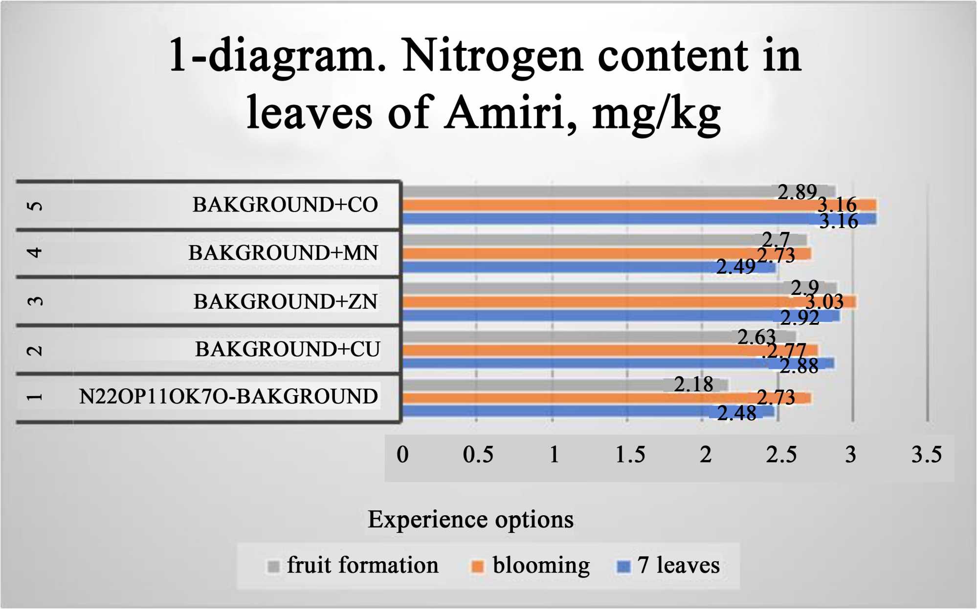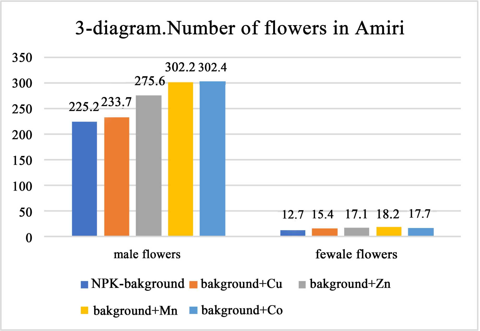 According to the data obtained in the experiment, microelements had a significant effect on the total nitrogen content of leaves in different phases of development and on the number of male and female flowers in the plant. It was found that the total nitrogen content in both varieties increased from the 7-leaf stage of the plant to the flowering phase and decreased by the fruit formation period. In particular, the nitrogen content in the Amiri variety in the N220P110K70 background variant was 2.48 mg/kg at the 7-leaf stage, 2.73 mg/kg at the flowering phase, and 2.18 mg/kg at the fruit formation period, respectively (Figure 1).