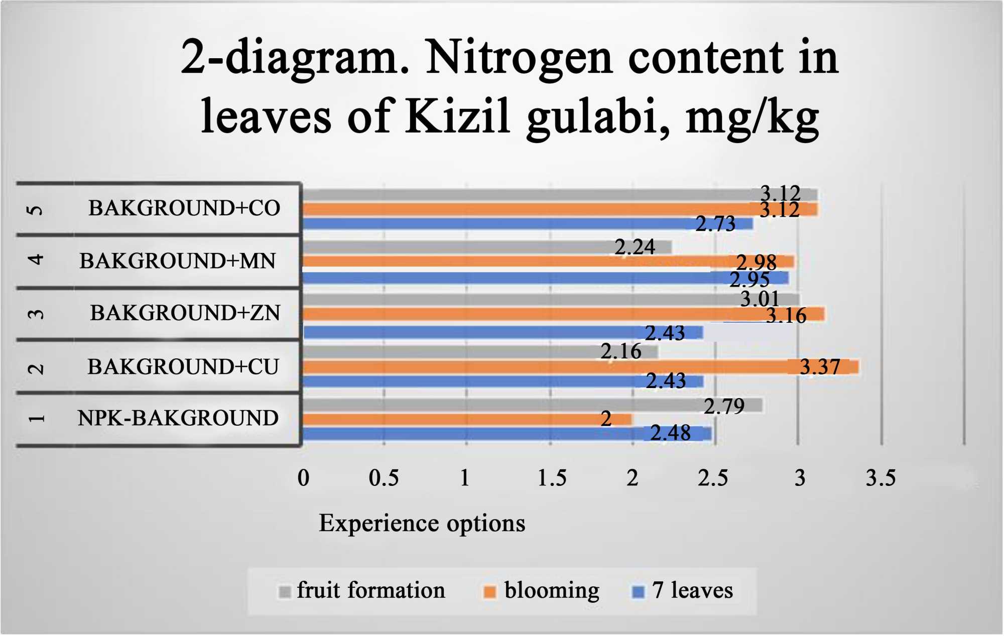 In the Amiri variety, the highest nitrogen content during fruit formation was determined in the variant where the zinc microelement was applied—2.90 mg/kg which was made up 33 percentage of growth in nitrogen content. In the Kizil gulabi variety, the highest nitrogen content in the leaves was observed in the variant where cobalt was applied and was 3.12 mg/kg that resulted for 11,82 % rising in nitrogen content during fruit formation. In general, according to the experimental results, we can see that the zinc microelement had a positive effect on the nitrogen content in the leaves. The scientific literature also highlights the existence of a mutual relationship between zinc and nitrogen in the development of crops. According to the experiments of Meng Li et al., zinc application helps in the accumulation and assimilation of nitrogen. It was found that zinc application increased the activity of nitrate reductase and glutamine synthetase in wheat, millet, and rice and enhanced the assimilation of NH4+, and as a result, the concentration of amino acids and proteins increased [28]. On the contrary, zinc deficiency has been reported to cause disturbances in nitrogen metabolism, including decreased protein and free amino acid production and accumulation of amides in rice meristem tissues [29].