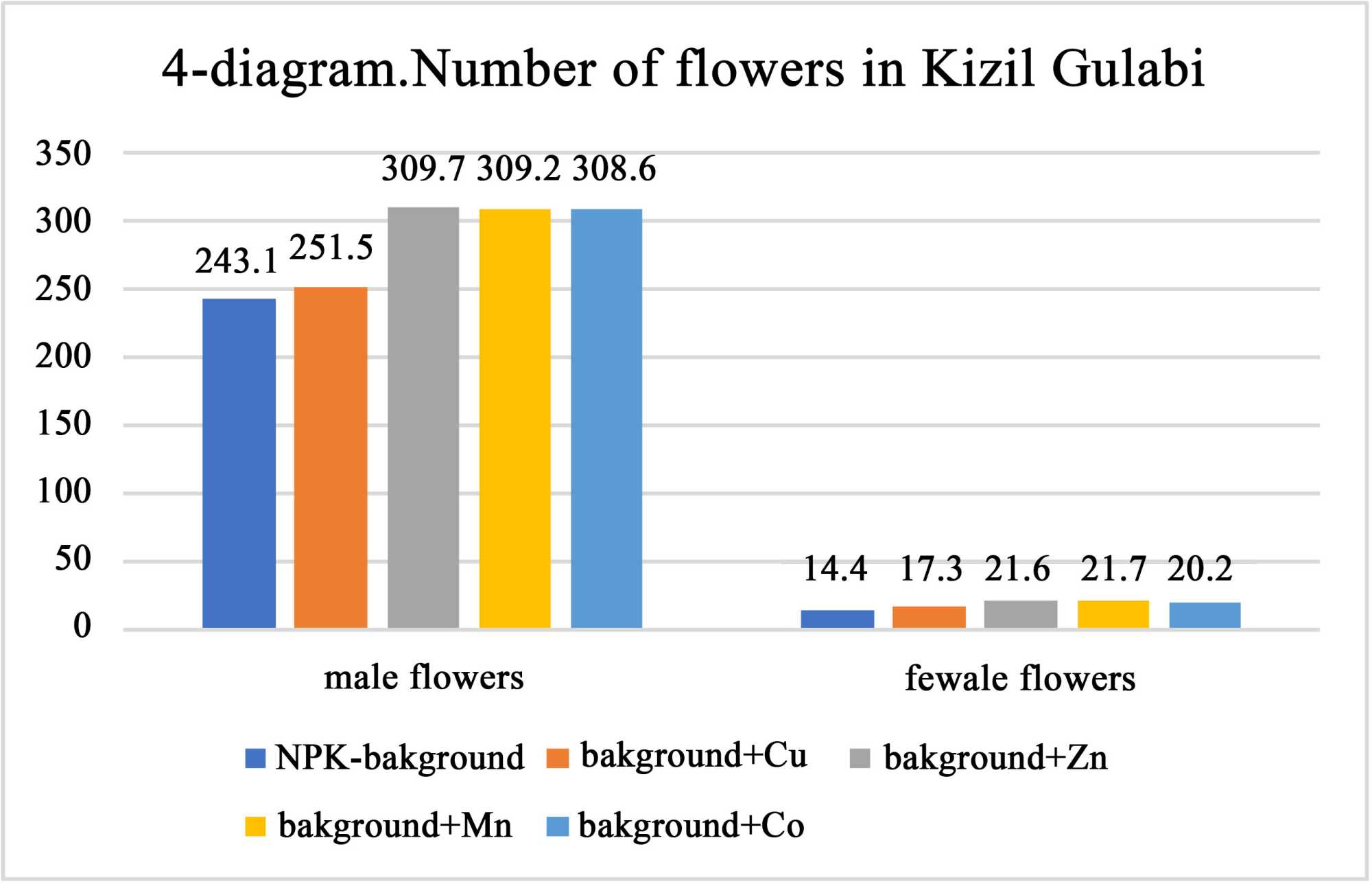 The number of flowers, including female flowers, formed in the melon plant is noteworthy. The results show that the Amiri variety formed the most male flowers under the influence of the cobalt microelement, 302.4 pieces, while the female flowers formed the most when manganese was applied and amounted to 18.2 pieces (Figure 3). The Kizil gulabi variety formed the most male flowers when zinc and manganese were applied, and amounted to 309.7 and 309.2 pieces, respectively. Similarly, the zinc and cobalt microelements affected the formation of the most female flowers, and 21.0 and 21.2 pieces of female flowers were formed, respectively (Figure 4). In the variants where manganese and zinc were applied, flowers, including female flowers, were formed in large numbers. Based on the result of the research, yield depends on the number of female flowers produced by the plant. For that reason, increasing the number of female flowers is vital to acquire the yield [30].