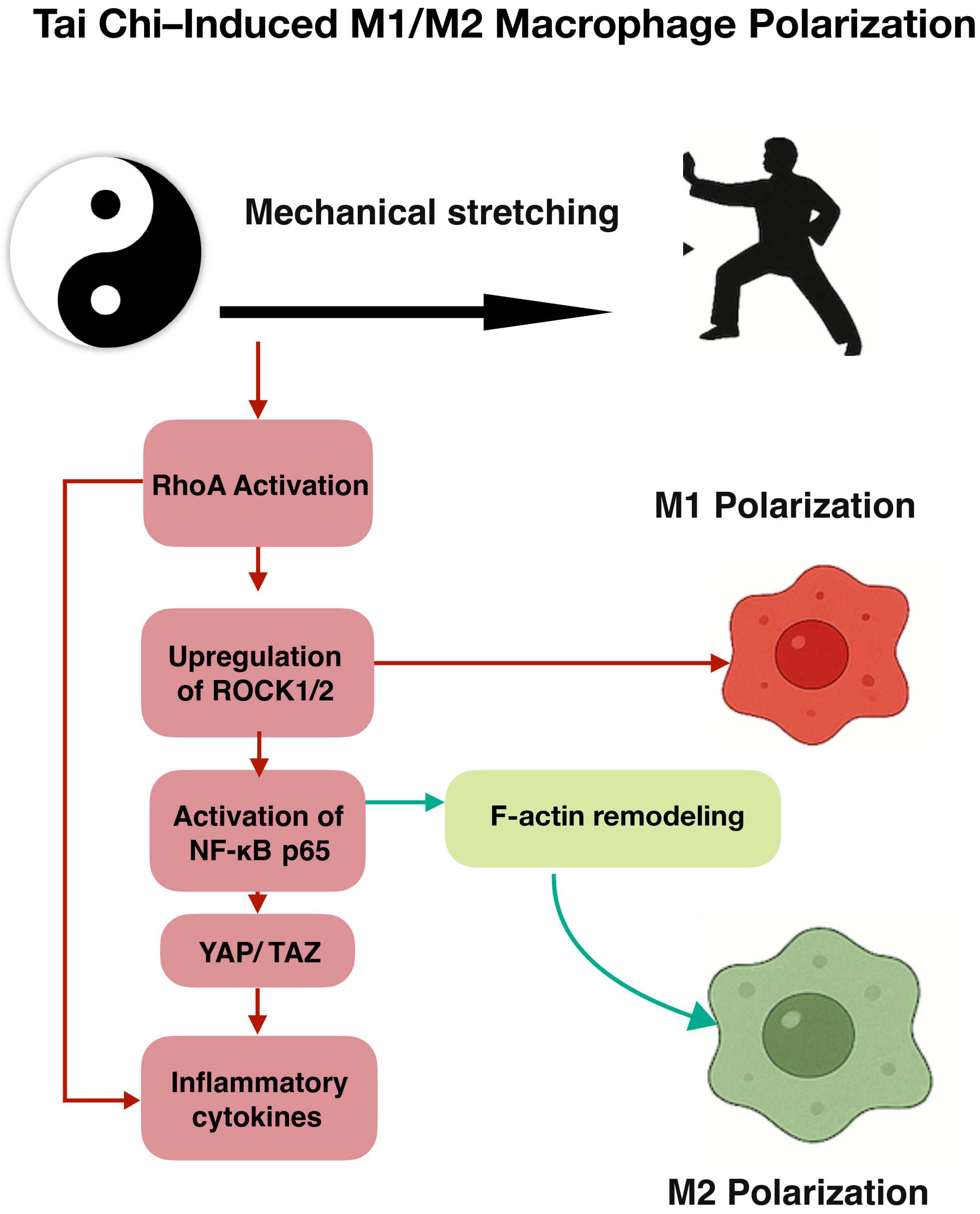 Based on this, it is hypothesized that Tai Chi may indirectly guide macrophages toward a pro-healing (M2) phenotype by modulating the mechanical signaling background provided by the fascial system, thus contributing to maintaining immune homeostasis and regulating inflammatory responses.
