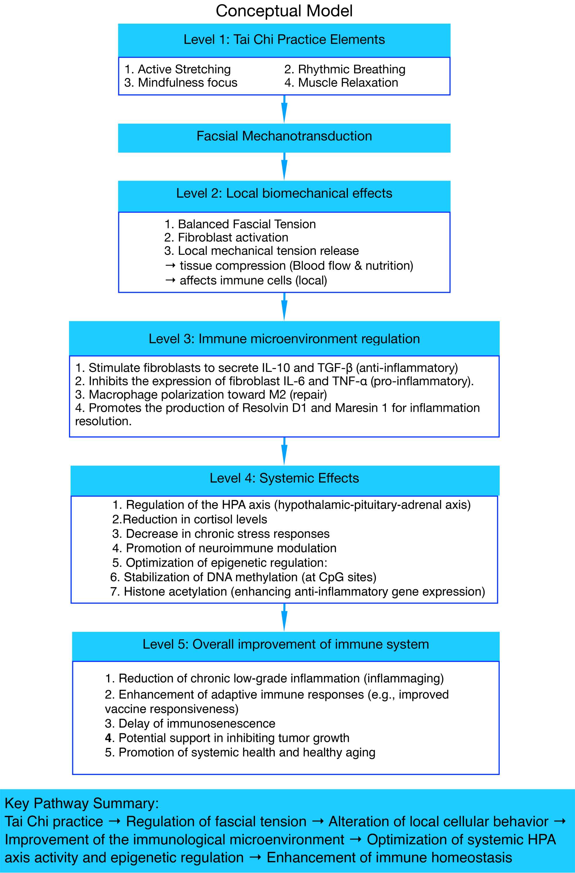 This review has demonstrated that as a mind-body integrative practice combining physical movement, breath regulation, and meditative awareness, Tai Chi exerts multi-dimensional and multi-pathway immunoregulatory effects. Across levels of fascial biomechanics, immune cell polarization, HPA axis modulation, epigenetic remodeling, and the mitigation of immunosenescence, Tai Chi engages a complex interplay of biomechanical, neuroendocrine, and molecular-epigenetic mechanisms to promote immune homeostasis. Notably, Tai Chi has been shown to reduce inflammatory burden, optimize T cell function and antibody production, and reprogram immune-related gene expression patterns—all of which contribute to healthier immune aging.
