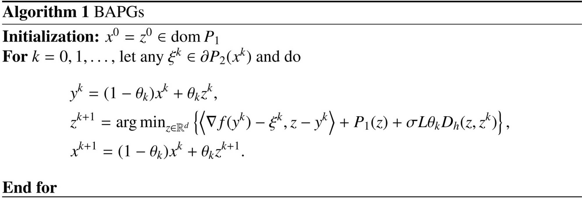 So to solve (3.1), we adopt the Bregman modified second accelerated proximal gradient (BAPGs) method, which is a variant of the modified second accelerated proximal gradient (APGs) method by replacing the proximal operator by the minimization involving the Bregman distance.
