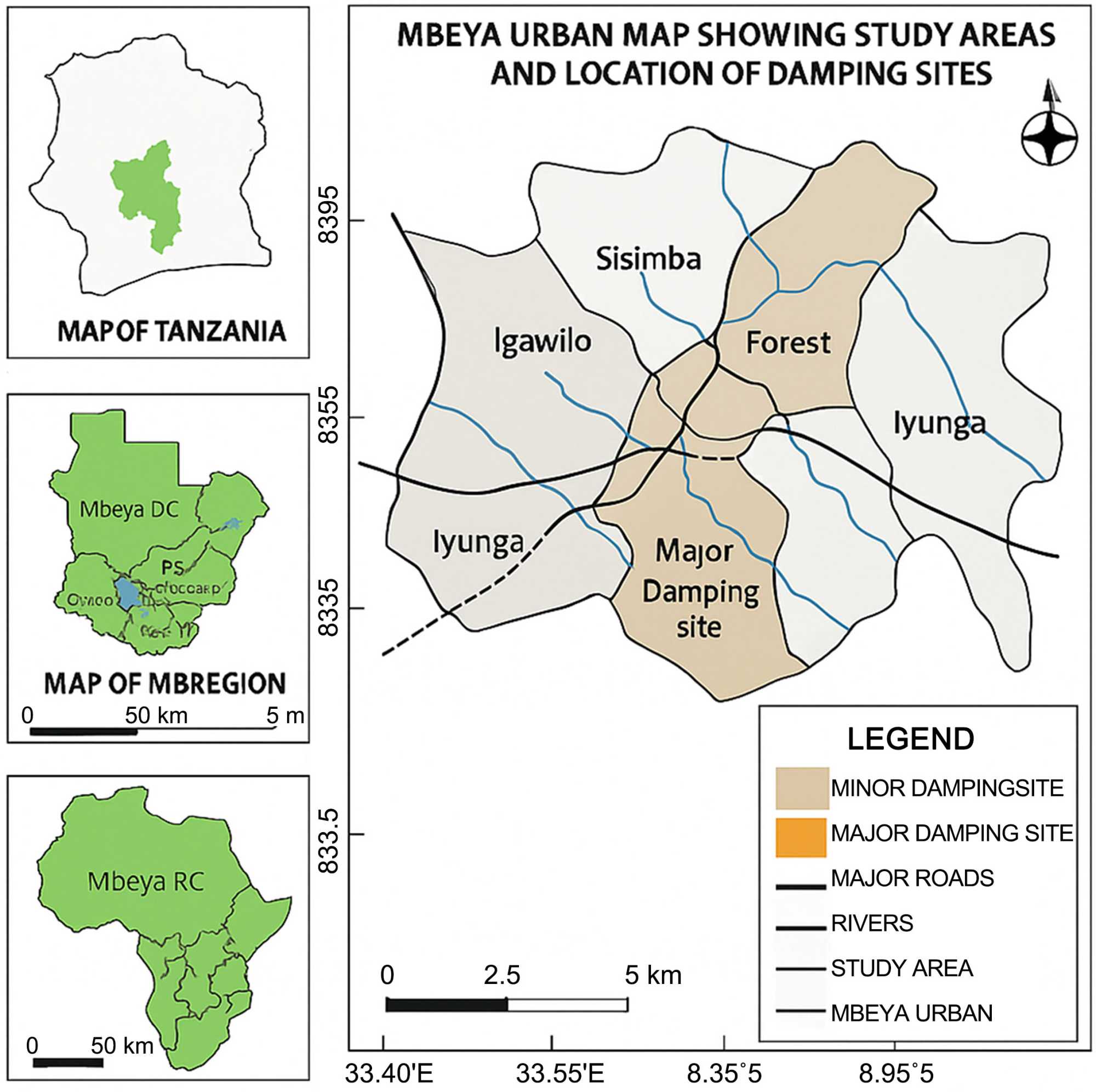 Mbeya City Council, located in the South West of Tanzania, has a population of 541,603 people and 153,100 households [13]. The city’s population growth rate is 3.2%, similar to the national average of 3.2% per annum [13]. Mbeya City is divided into two divisions, Iyunga and Sisimba, and has 36 wards, 181 hamlets, and 89,602 households. The city’s major economic activities include commerce, trade, agriculture, livestock keeping, industrial production, and service provision. 33.3% of the city’s residents depend on agriculture for their livelihood, while 21% are employed in the public sector. 43.4% are engaged in the informal sector, mainly small-scale production and selling of agricultural crops [14]. Mbeya City is part of the Mbeya Region, which includes other councils such as Mbeya District, Kyela, Busokelo, Mbarali, and Rungwe. The city is bordered to the north by Mbeya Rural District, to the east by Rungwe District, to the south by Ileje District in Songwe Regional, and to the west by Mbozi District in Songwe Regional [13].