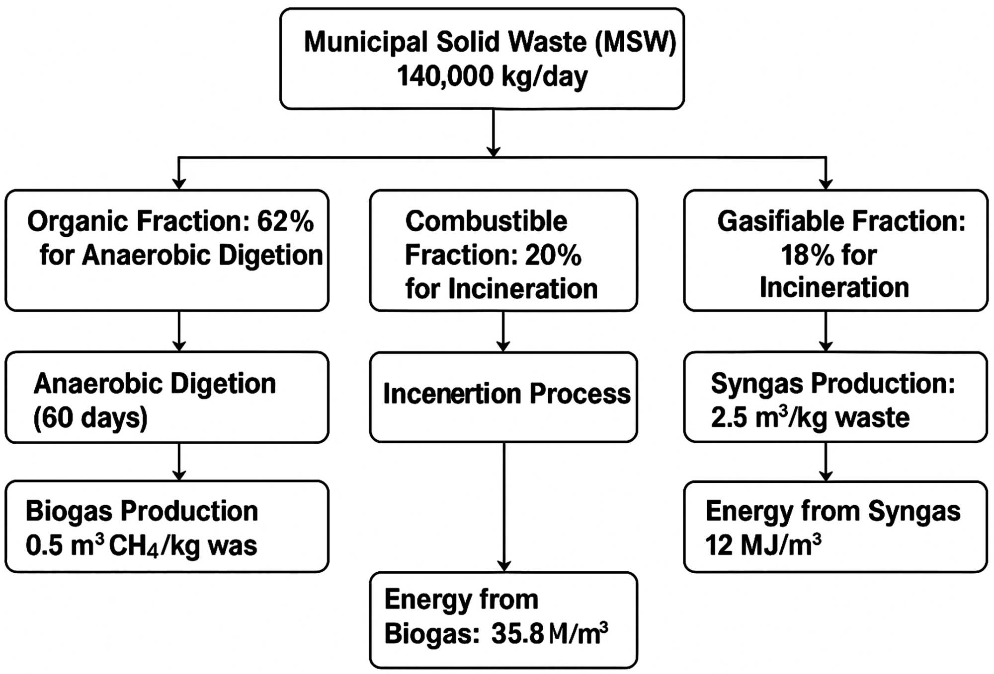 The simulation model conducts many simulations with varying waste compositions processing conditions and waste to energy technologies, facilitating comparisons across diverse scenarios [24]. Efficiency parameters are integrated to ascertain process-specific efficiency, including heat efficiency for incineration and conversion efficiency for anaerobic digestion [25]. Calculations of environmental effect are included to estimate emissions from energy recovery processes and efficiency of each waste to energy technique [26].