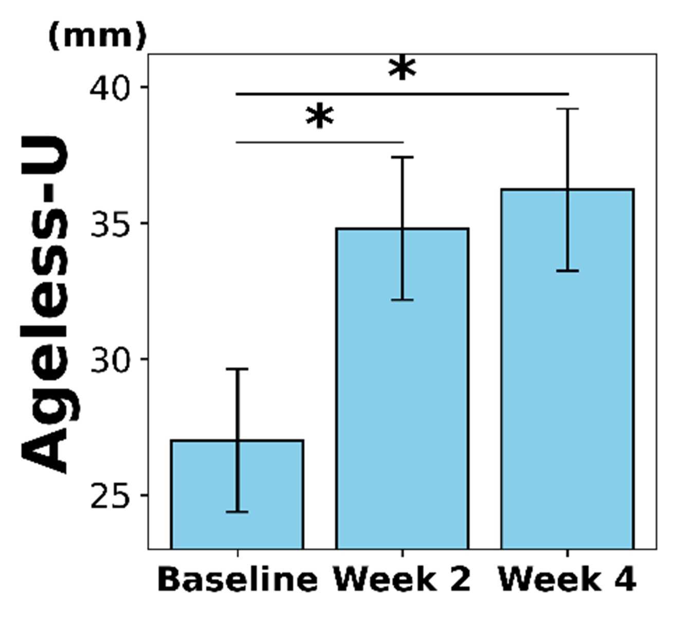 Figure 6. Effect of GFF-containing anti-aging skincare product on Ageless-U (N = 35). Significant improvements in Ageless-U were observed. *: P < 0.05.
