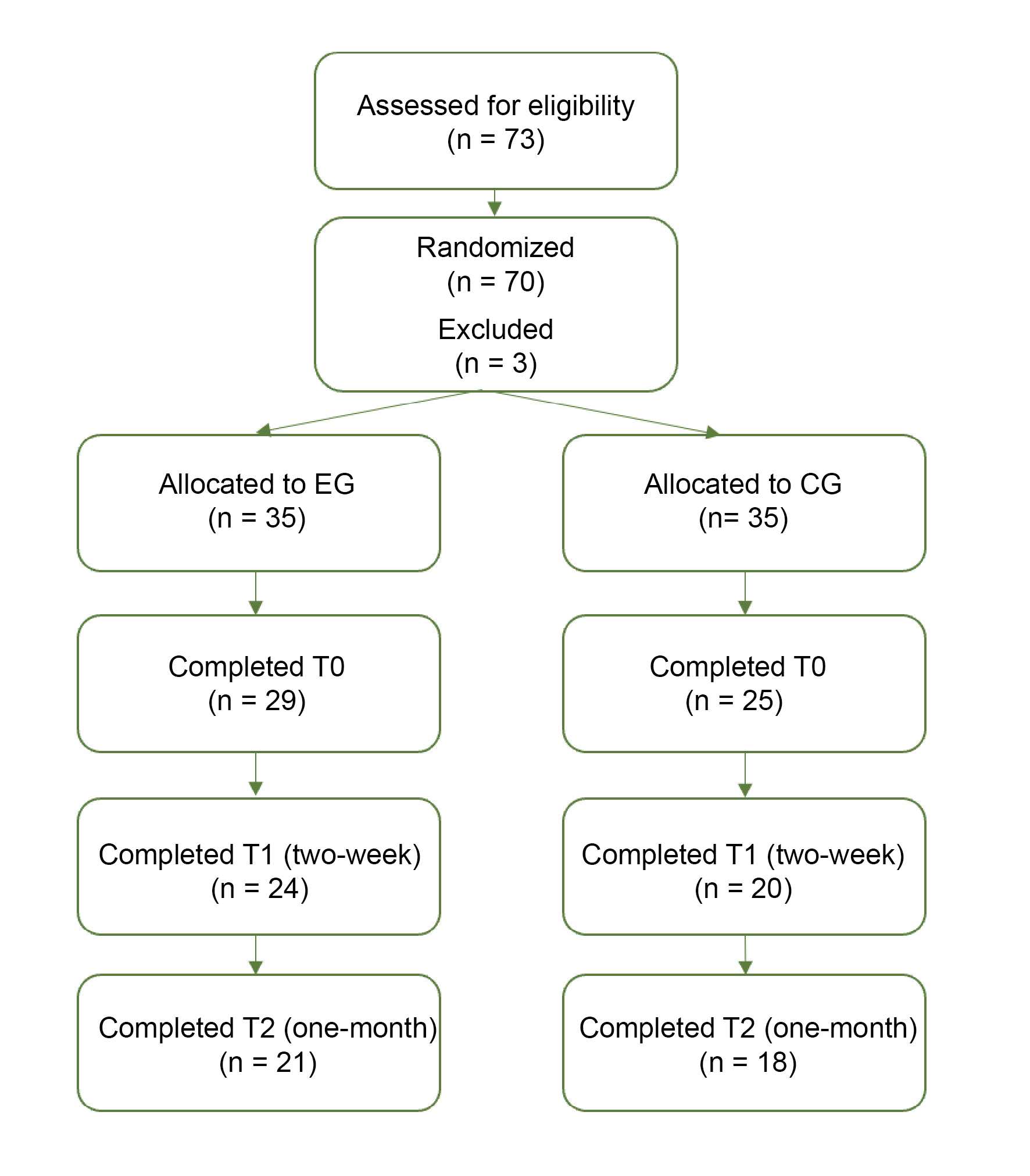 This study employed a between-subjects randomized controlled trial design with three measurement points: baseline (T0), after two weeks (T1), and after one month (T2).