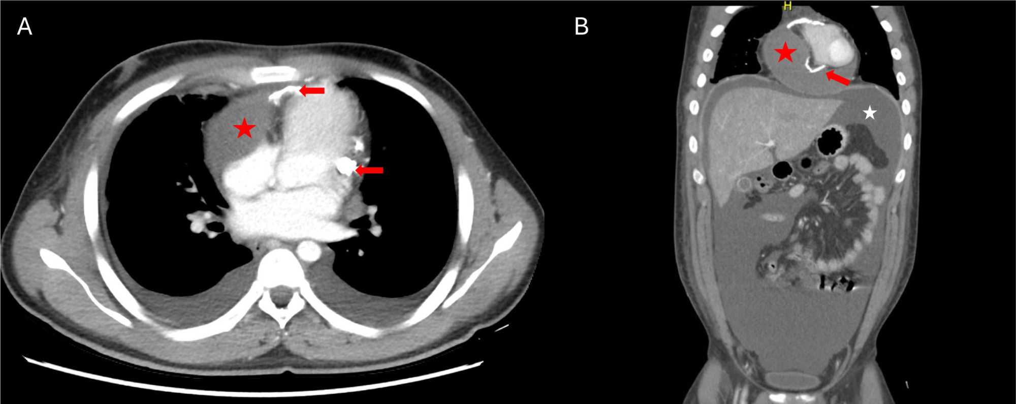 Figure 1. Panel (A) Chest CT scan with contrast (axial view) shows a loculated extracardiac cyst compressing the right side of heart (Red star), with heavy calcification of the pericardium (Red arrows). Panel (B) Abdomen CT scan with contrast (coronal view) with lower chest cut shows extracardiac cyst (Red star) with cyst wall calcification (Red arrow) and significant abdominopelvic ascites (white star).