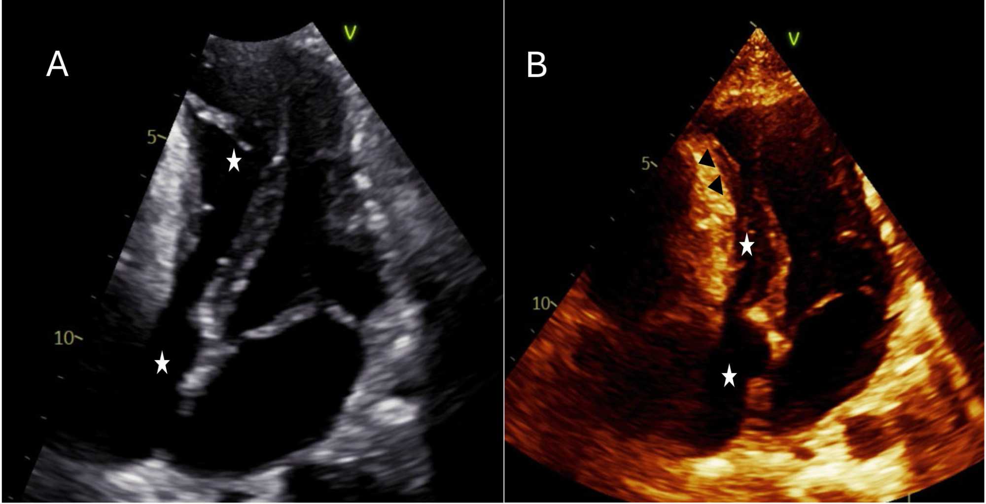 Figure 2. Panel (A-B) Transthoracic echo four chamber apical view shows the compressive effect of the cyst on the right side of the heart resulting in slit like right ventricle and right atrium (white stars). Panel (B) hyperechoic cyst wall lateral to the midbasal and midapical RV free wall (Black arrowheads).