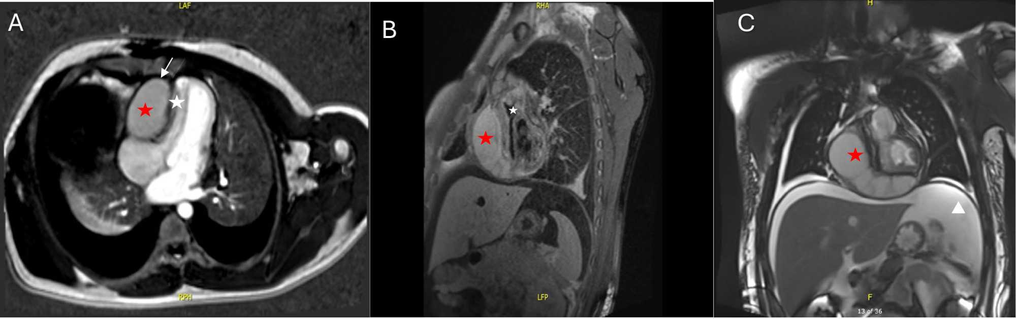 Figure 3. Panel (A-C) Cardiac magnetic resonance imaging (CMR). Red stars in all images shows the pericardial cyst. Panel (A) Early phase gadolinium enhanced MRI of the four chamber view showing compressed and slit like right ventricle (white star). Enhnacement of both visceral and parietal pericardium surrounding the capsule of the cyst (white arrows). Panel (B) midventricular short axis-view showing severely compressed right ventricle (white star). Panel (C) coronal view showing abdominal ascites (white arrowhead).