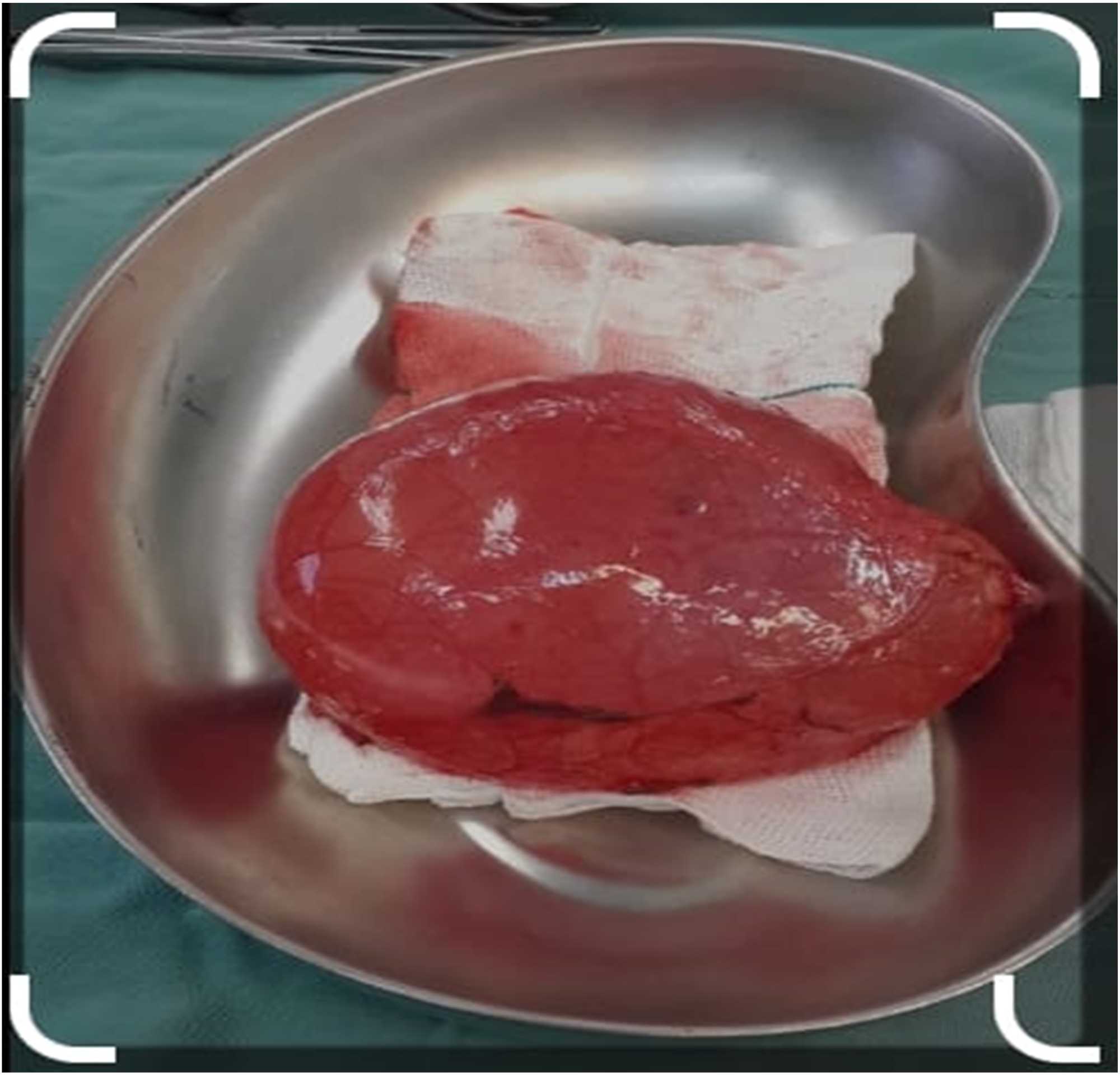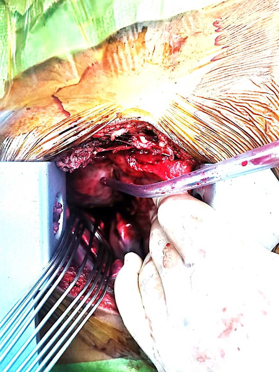 Our patient’s pericardial cyst was large and causing pressure symptoms, so surgical intervention was required. Surgery was performed via right thoracotomy. Intraoperatively, there was a huge, thick-walled calcified pericardial cyst compressing the right side of the heart. The cyst was dissected from its surrounding lung and mediastinal structures. The cyst wall was inseparable from the right atrium. Most of the cyst was resected and its inseparable part from cardiac structures was left to avoid chamber perforation and massive bleeding (Figure 4 and Figure 5). A total of 800 ml of dark-colored fluid was drained. Pericardial fluid reports for TB and malignant cells were negative. Postoperatively, the patient made an uncomplicated recovery. His blood pressure improved spontaneously. Ascites and pedal edema were reduced significantly without any diuretic therapy and were not present in the first clinic follow-up.