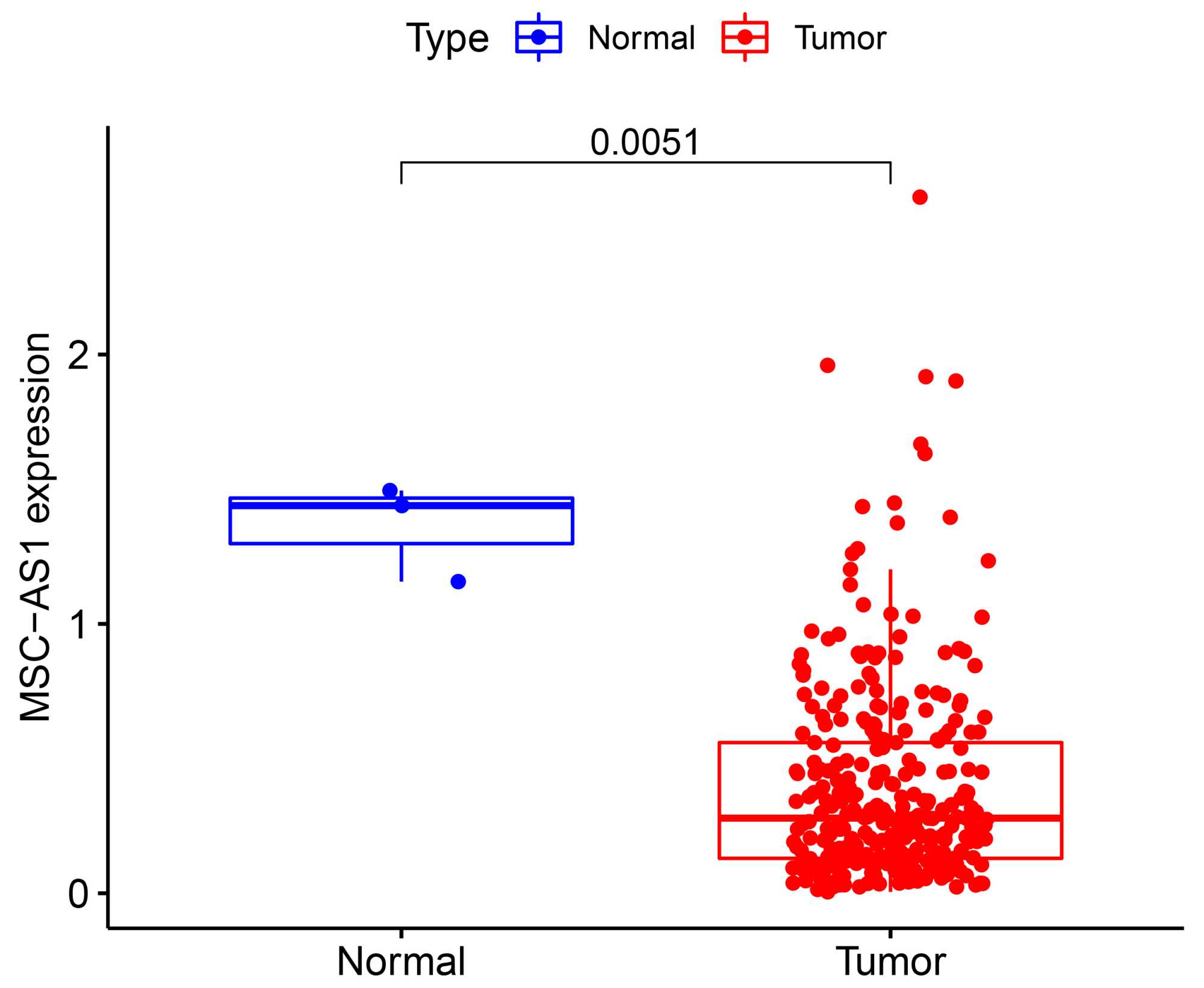 Figure 7. (a) Scatter diagram of co-expression of MSC-AS1 and hsa-miR-33b-5p; (b) Scatter diagram of correlation between MSC-AS1 and target gene MSRB3; (c) Box diagram of MSC-AS1 expression differences in normal and final samples.